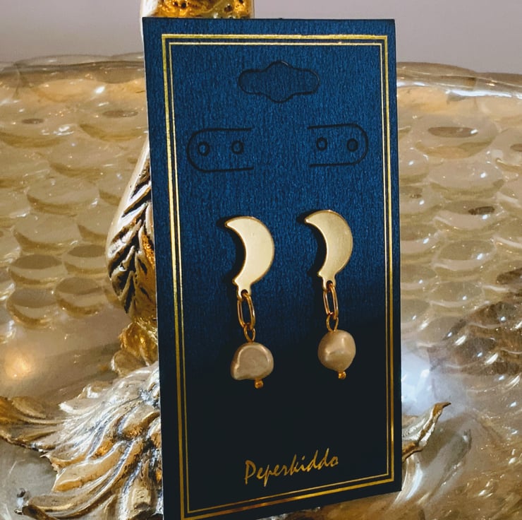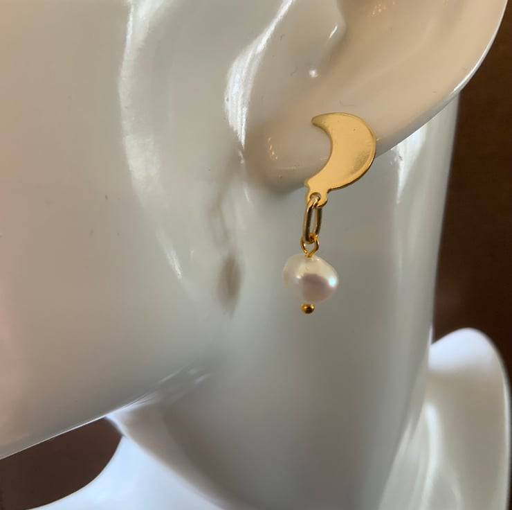 Stainless steel moon earrings with a stud back. In gold colour featuring freshwater pearls. Reflects beautifully in the light.