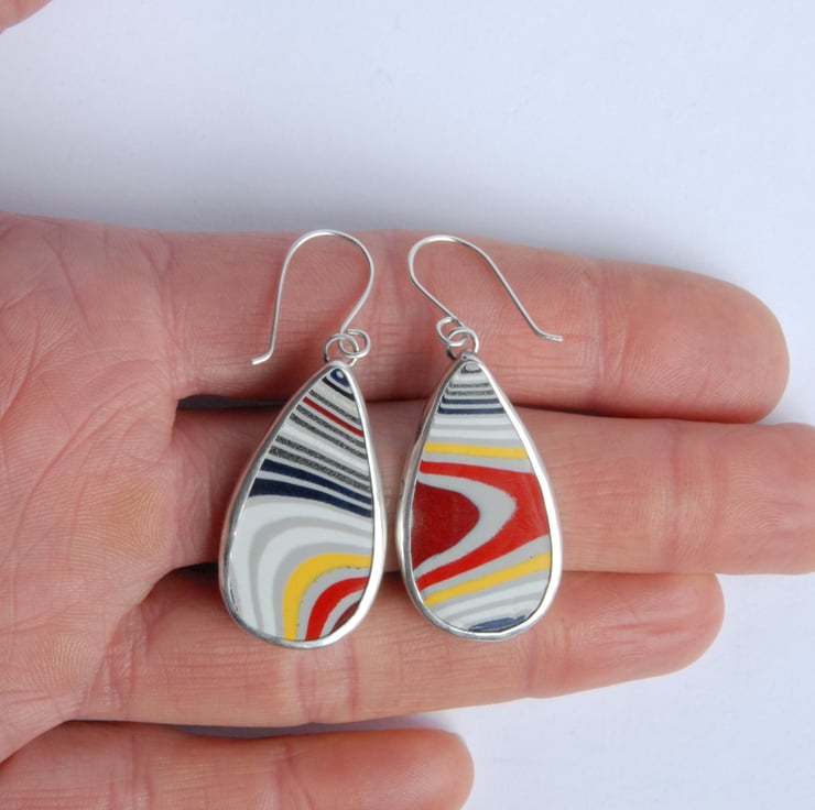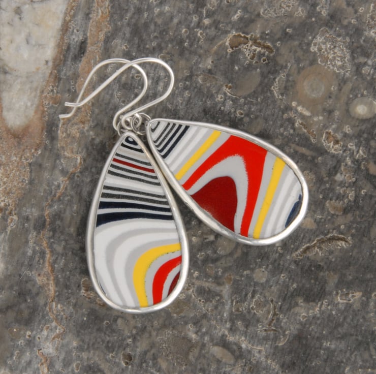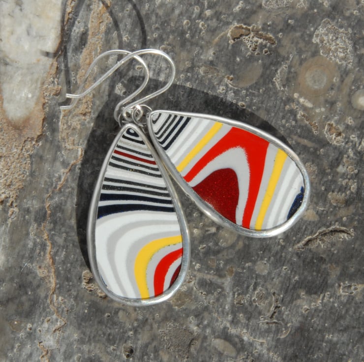 These eye catching earrings feature drops of fordite which has been bezel set in sterling silver. The fordite was cut from the same piece of rough so the colours match but the pattern doesn't, one earring has a sweep of sparkly dark red and matt bright red with finer stripes of yellow, grey and white. The other has broad stripes of white and grey with the red and yellow confined to one corner (it also has stripes of sparkly navy and dark grey at the top). The earrings measure approx 48mm from the top of the hook to the bottom by 18mm across and are finished with simple hooks (sterling silver). The fordite was quite thin so it has been stabilised at the back for strength but this makes the earrings particularly lightweight. Comes in a gift box.