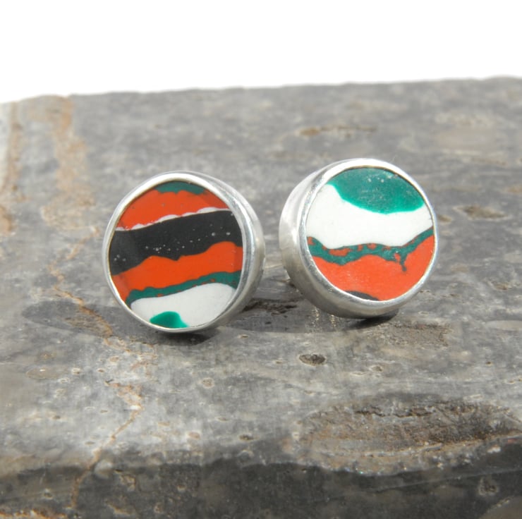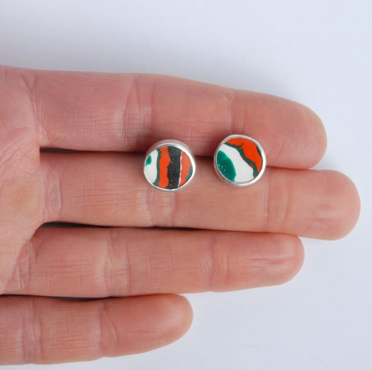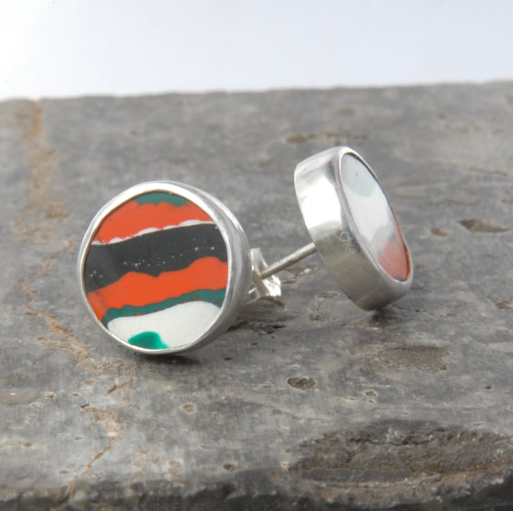 These statement stud earrings have eye catching rounds of colourful fordite which has been bezel set in sterling silver and finished off with sterling silver posts and scrolls.The fordite has broad bands of orange, green, white and black, they are not a matching pair but were cut from the same piece of rough material so make sense as a pair. They measure about 12mm diameter but are not heavy on the earlobes. Comes in a gift box.
