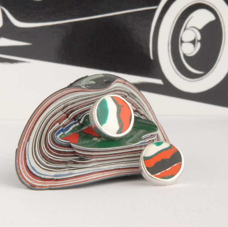 Fordite is the name given to many layers of cured paint that builds up in old style spray booths at vehicle factories, the paint gets baked hard in between each layer leading to a durable material that can be cut to show off the many colours. This particular material was sold to me as coming from a tractor factory (possibly a Ford plant in Dearborn, USA) in the 1930's and the colours are certainly consistent with the paint charts I've found for that era. I cut this material myself from the slabettes I bought so if you want me to make you something else drop me a message. Fordite is becoming increasingly hard to source thanks to more efficient painting processes, so if you love your cars get some of the unique material whilst you can.