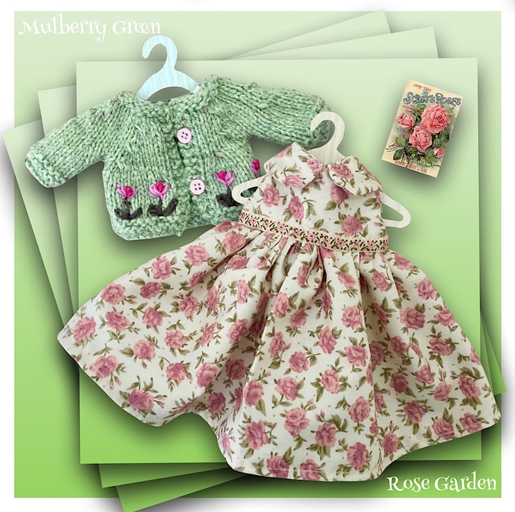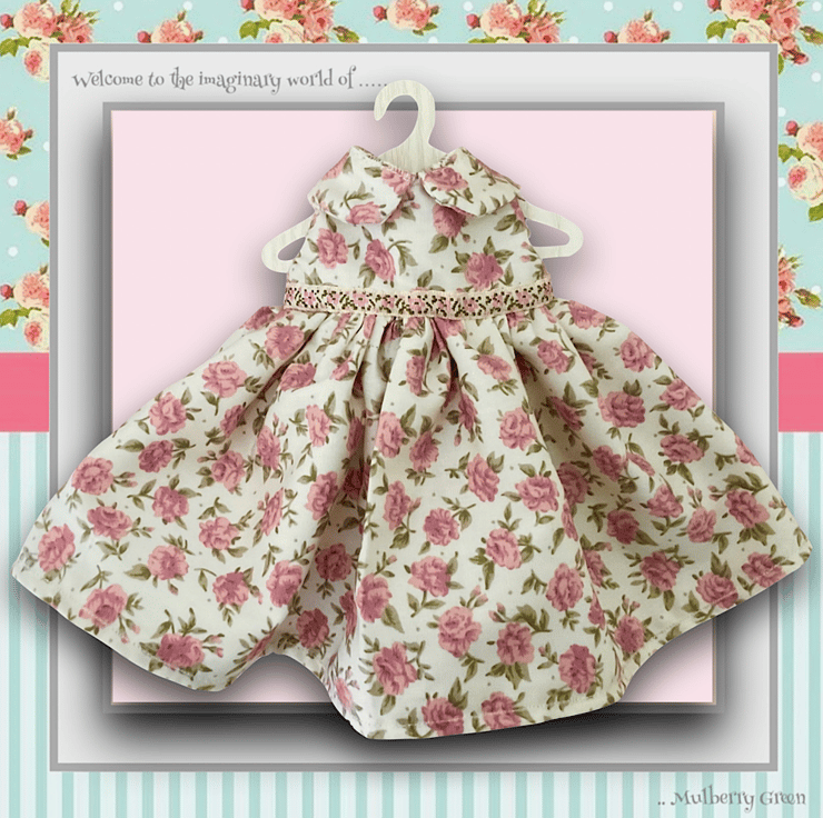 A beautiful little dress in a rose print with a woven waistband, to fit the Mulberry Green dolls. The dress is handmade from best quality designer cotton, has a lined bodice and a Peter Pan collar and fastens at the back with a little popper
