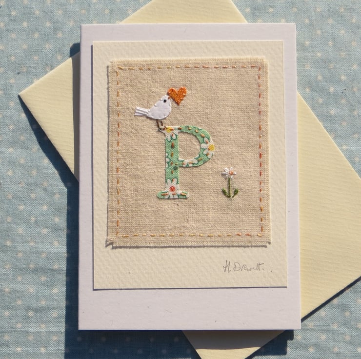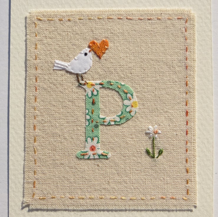 A hand-stitched card with the letter 'P' cut from pretty floral fabric stitched into place with tiny stitches. I have added a miniature applique dove with heart in her beak, and then embroidered a tiny daisy flower to complete the design.