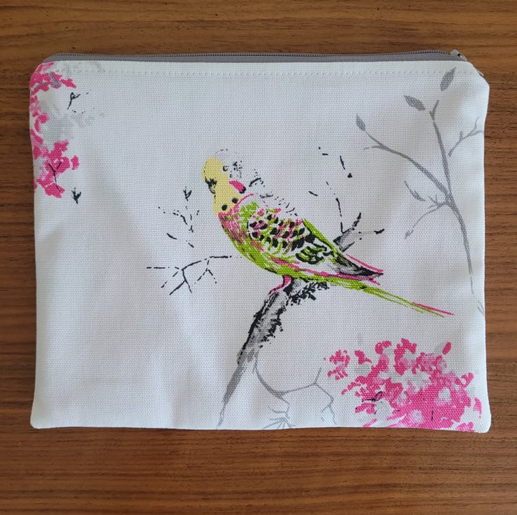 Zip pouch made with a budgie fabric remnant, lined with a coordinating cotton fabric and finished off with a matching grey zip. Perfect for all sorts of uses: cosmetic purse, handbag organiser, craft project pouch.