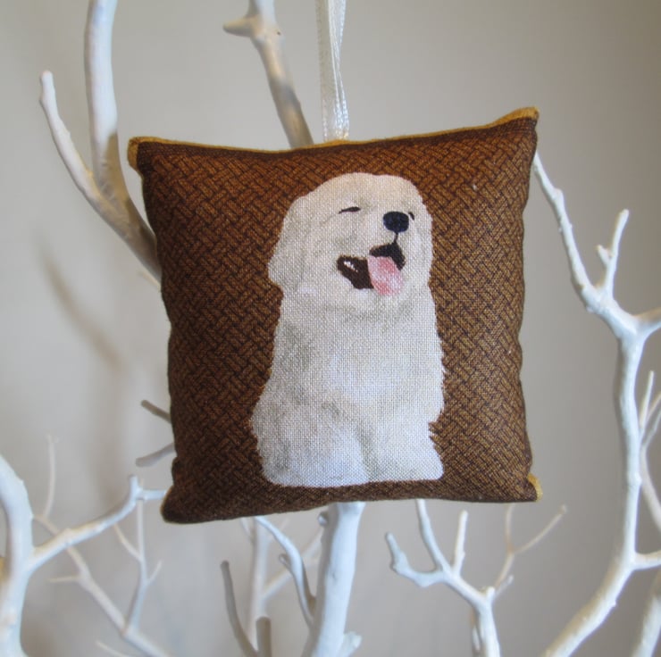 An adorable square pillow filled with English lavender and hollow-fibre stuffing just ideal for hanging anywhere as a decorative item or in a wardrobe or drawer as lavender is a renowned natural moth repellent. This lavender bag measures approximately three and a quarter inches (8.5 cm) square excluding hanging loop (3.5 in / 9 cm) and is pleasingly filled to give a plump look. The front depicts a lovely dog and the back is patterned brown with a hanging loop of cream satin ribbon. This quaint item has a lovely traditional scent and makes a lovely gift as well as something for yourself.