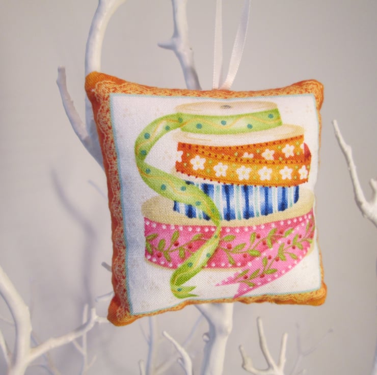 An adorable square pillow filled with English lavender and hollow-fibre stuffing just ideal for hanging anywhere as a decorative item or in a wardrobe or drawer as lavender is a renowned natural moth repellent. This lavender bag measures approximately three and a quarter inches (8.5 cm) square excluding hanging loop (3.5 in / 9 cm) and is pleasingly filled to give a plump look. The front depicts a selection of ribbons and the back is plain cream with a hanging loop of cream satin ribbon. This quaint item has a lovely traditional scent and makes a lovely gift as well as something for yourself.