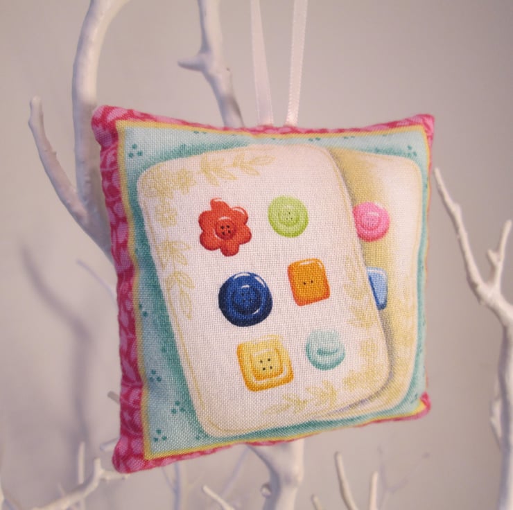 An adorable square pillow filled with English lavender and hollow-fibre stuffing just ideal for hanging anywhere as a decorative item or in a wardrobe or drawer as lavender is a renowned natural moth repellent. This lavender bag measures approximately three and a quarter inches (8.5 cm) square excluding hanging loop (3.5 in / 9 cm) and is pleasingly filled to give a plump look. The front depicts a selection of buttons and the back is plain cream with a hanging loop of cream satin ribbon. This quaint item has a lovely traditional scent and makes a lovely gift as well as something for yourself.