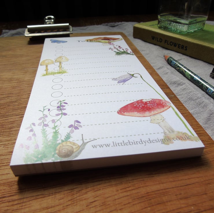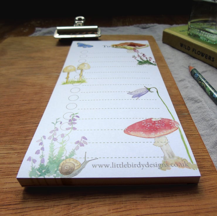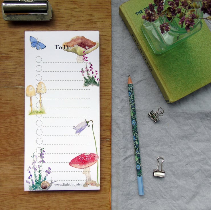 Brighten your desk with this beautifully illustrated note pad featuring my watercolour paintings of toadstools, heather and insects with a 'to do' checklist complete with tick boxes.
