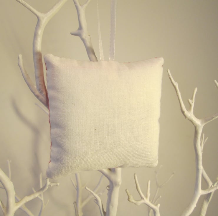 An adorable square pillow filled with English lavender and hollow-fibre stuffing just ideal for hanging anywhere as a decorative item or in a wardrobe or drawer as lavender is a renowned natural moth repellent. This lavender bag measures approximately three and a quarter inches (8.5 cm) square excluding hanging loop (3.5 in / 9 cm) and is pleasingly filled to give a plump look. The front depicts a selection of sewing cottons and the back is plain cream with a hanging loop of cream satin ribbon. This quaint item has a lovely traditional scent and makes a lovely gift as well as something for yourself.