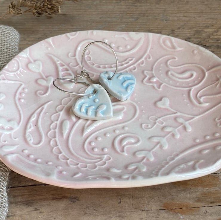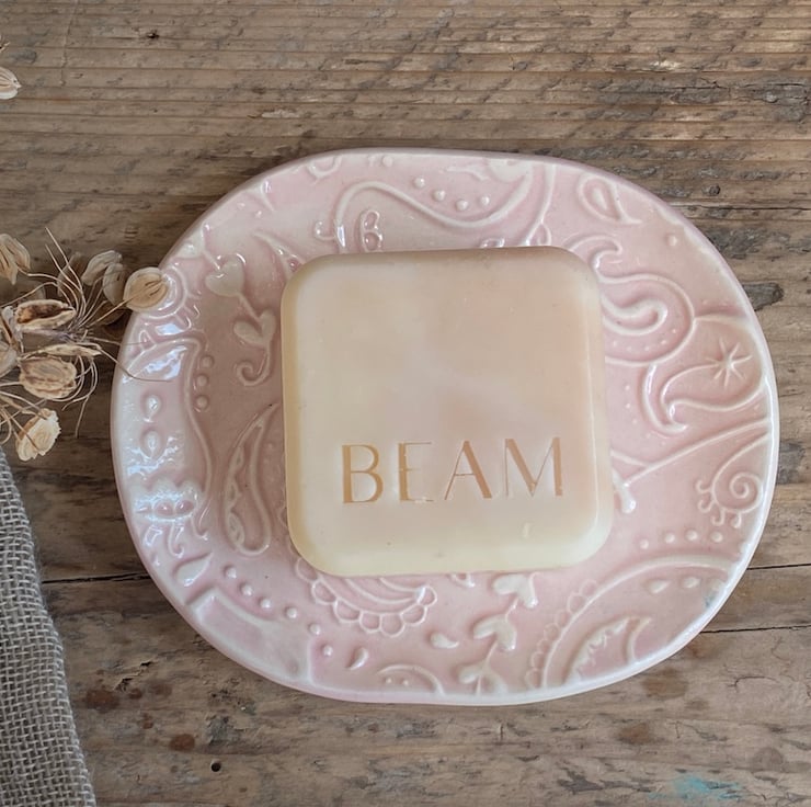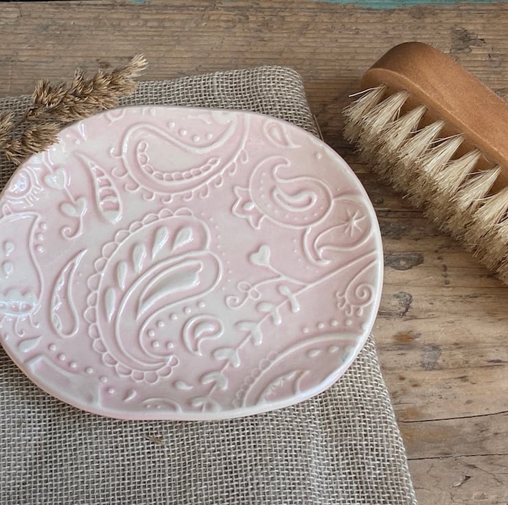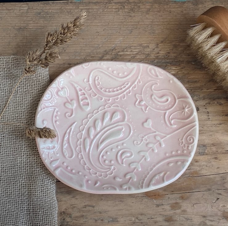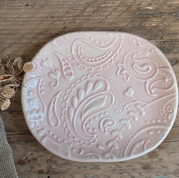 This beautiful dish has been imprinted with an original MatildaBelle Paisley Carving, giving a wonderful raised design. Glazed in pink and rubbed back to further reveal the unique pattern.