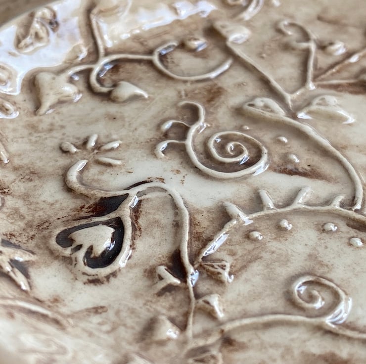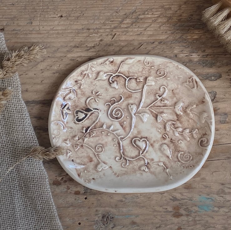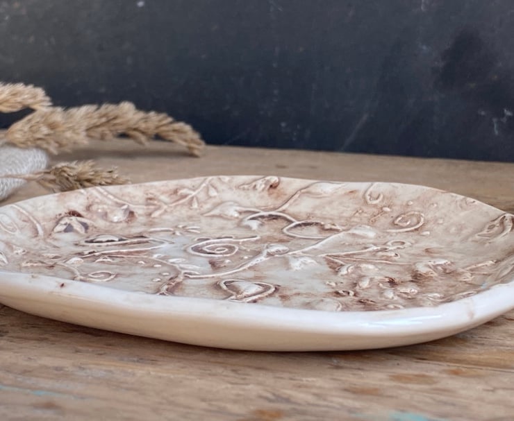 This beautiful dish has been imprinted with an original MatildaBelle Botanical carving, giving a wonderful raised design. Glazed to give a gentle aged effect.