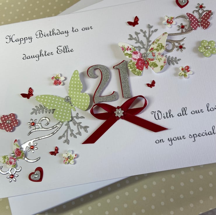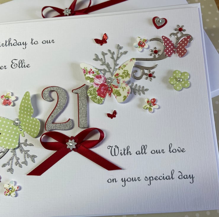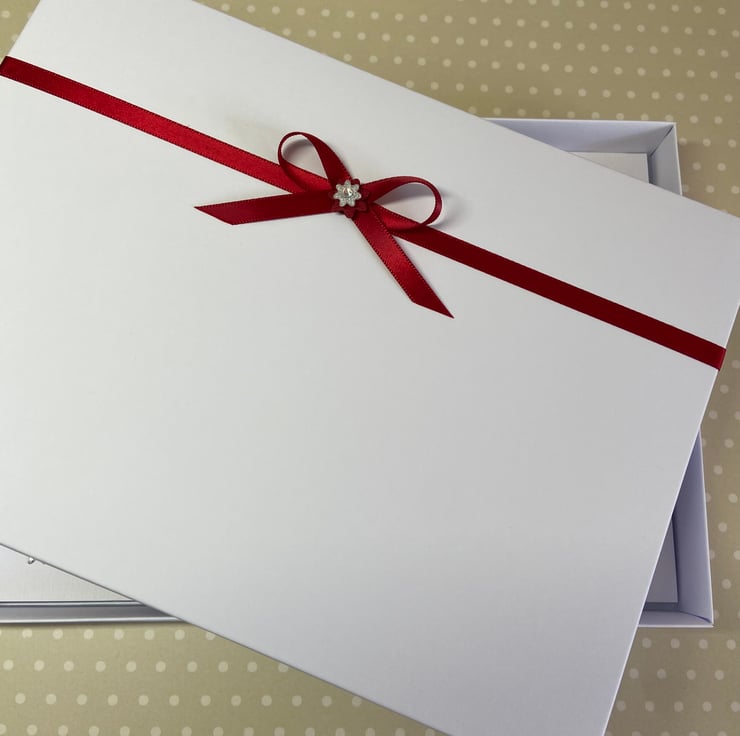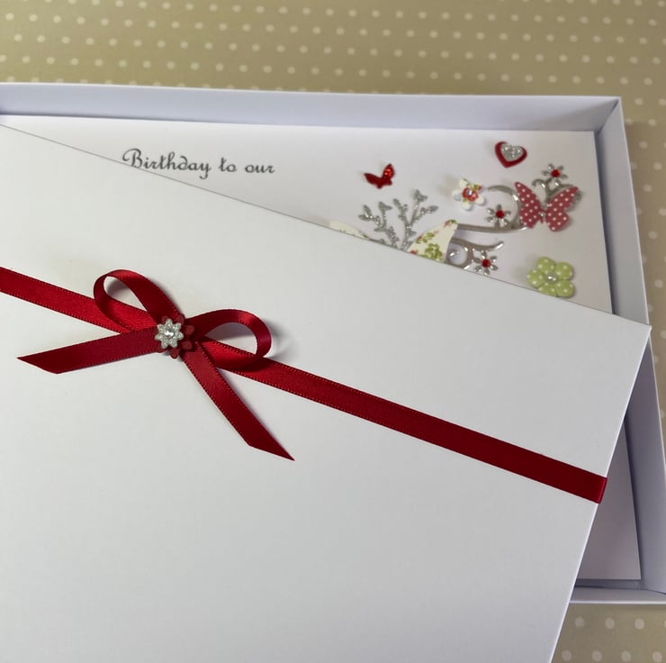 This handmade gift boxed card is A5 in size (210mm x 150mm) and can be personalised for any special birthday. It is on 300gsm ivory linen cardstock and decorated with ribbons and gems. It comes in the matching decorated box and makes a wonderful keepsake.