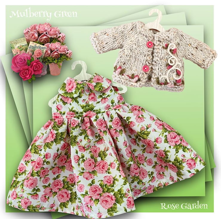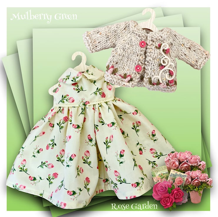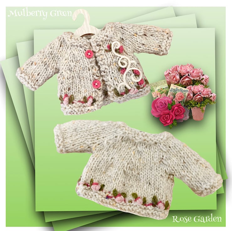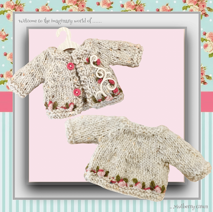 A lovely little two cream cardigan embroidered with a satin swirl and lots of sweet little rosebuds, to fit the Mulberry Green characters. The cardigan is hand knitted and matches The other ‘Rose Garden’ items in my shop.