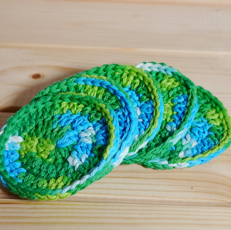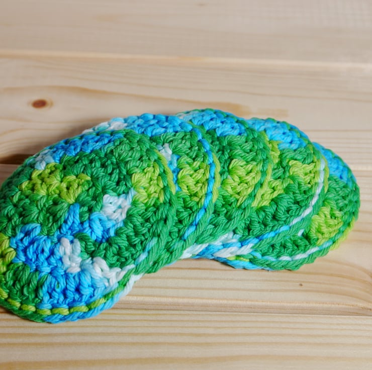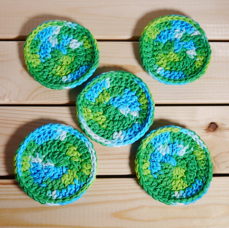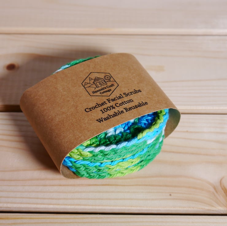 These 100% crochet facial rounds or scrubbies are an ideal purchase if you are trying to make some eco friendly choices, use these instead of disposable wipes or cottonwool with cleansers, toners or make up remover, then just bung in the washing machine and use again. Sold in sets of five and presented with a kraft card belly band they also make a great present, stocking filler, secret Santa or hamper item. The green and blue hues of this set make me thing of the loch ness monster swimming in the depths, each round measures approximately 3 inches (7.5cm) across. Wash as cotton, reshape while damp, and if desired press with an iron to return to original flatness. Created in a smoke and pet free home.