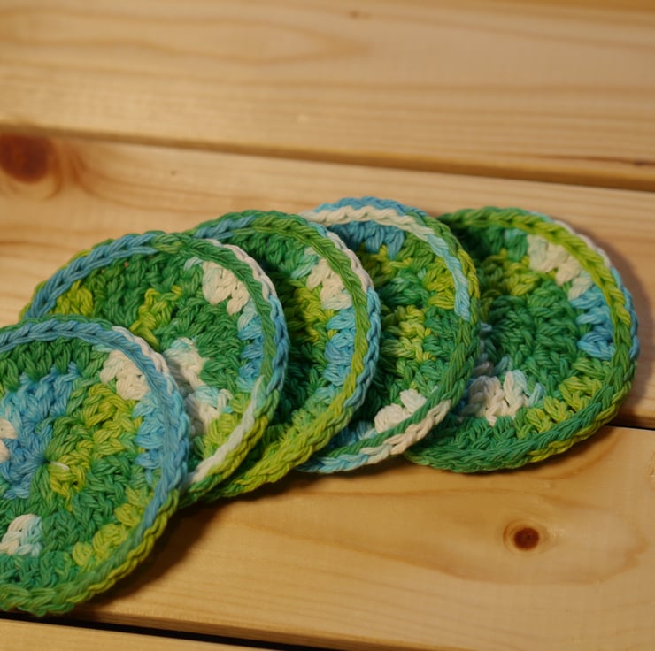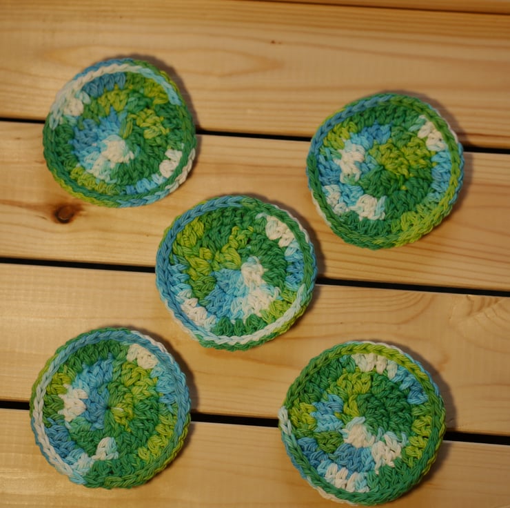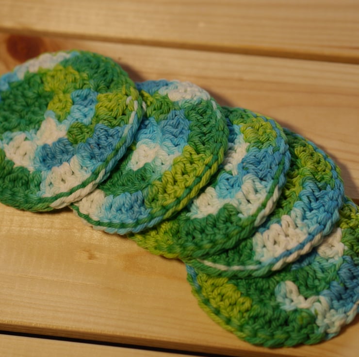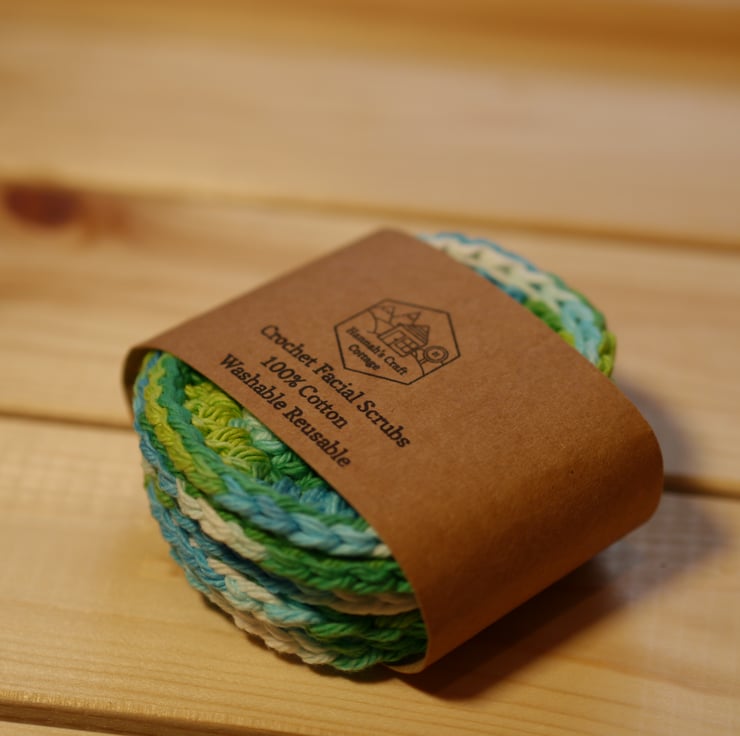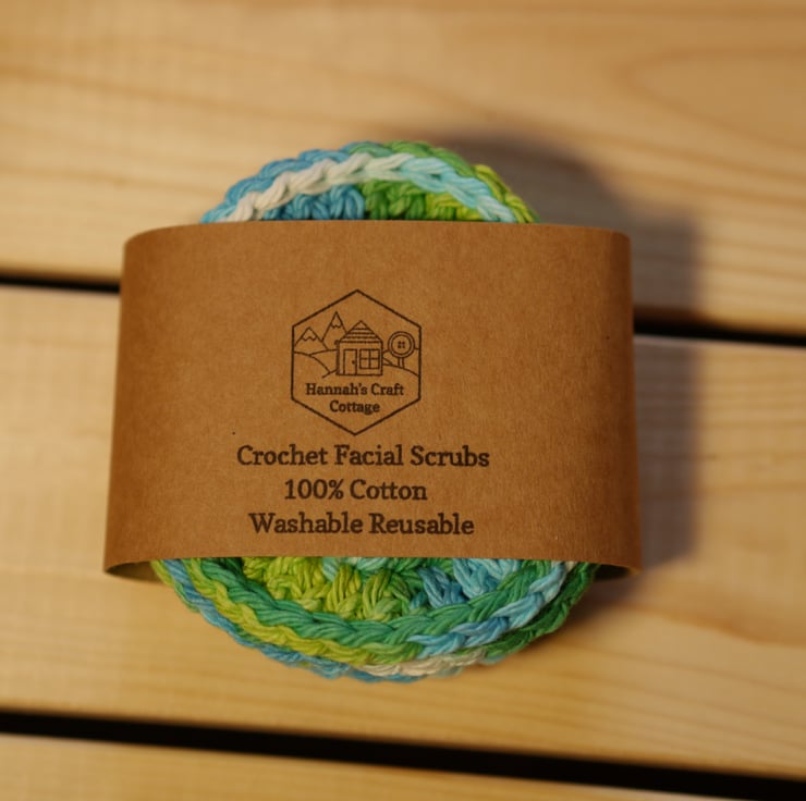 These 100% crochet facial rounds or scrubbies are an ideal purchase if you are trying to make some eco friendly choices, use these instead of disposable wipes or cottonwool with cleansers, toners or make up remover, then just bung in the washing machine and use again. Sold in sets of five and presented with a kraft card belly band they also make a great present, stocking filler, secret Santa or hamper item. The green and blue hues of this set make me thing of the loch ness monster swimming in the depths, each round measures approximately 3 inches (7.5cm) across. Wash as cotton, reshape while damp, and if desired press with an iron to return to original flatness. Created in a smoke and pet free home.