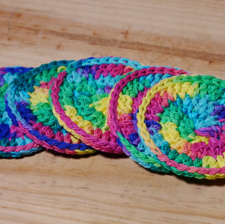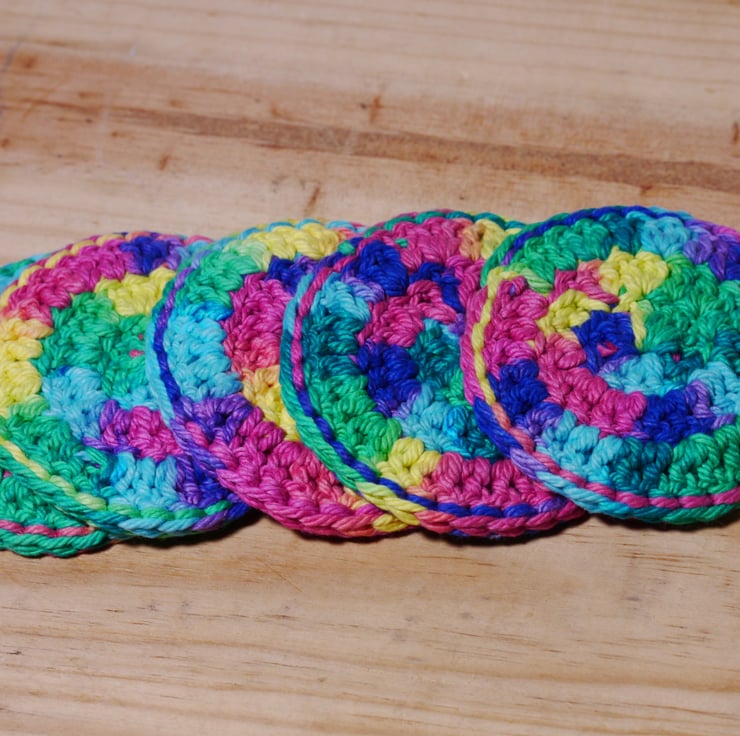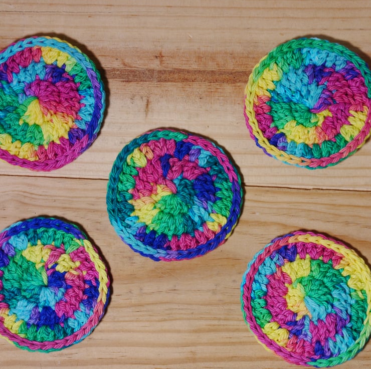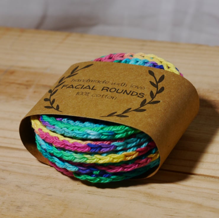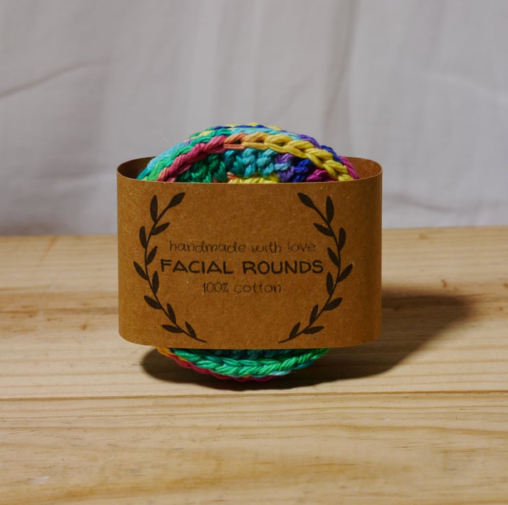 These 100% crochet facial rounds or scrubbies are an ideal purchase if you are trying to make some eco friendly choices, use these instead of disposable wipes or cottonwool with cleansers, toners or make up remover, then just bung in the washing machine and use again. Sold in sets of five and presented with a kraft card belly band they also make a great present, stocking filler, secret Santa or hamper item. In rainbow bright psychedelic colours these are bound to brighten up anyone's bathroom routine, each round measures approximately 3 inches (7.5cm) across. Wash as cotton, reshape while damp, and if desired press with an iron to return to original flatness. Created in a smoke and pet free home.