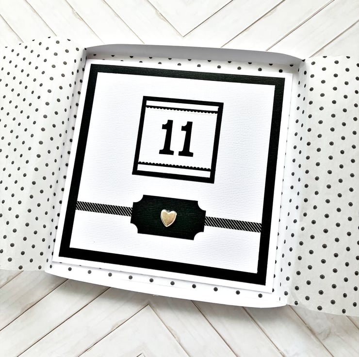 If you would like your card to be wrapped in black polka dotted tissue paper and presented in a beautiful gift box decorated with a white wooden heart on a black background instead of an envelope, then you can select that option instead. Box dimensions 16cm x 16cm x 1.5cm approx.