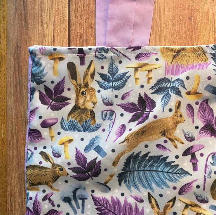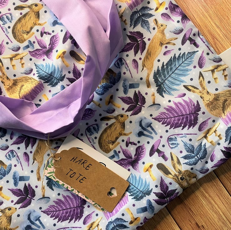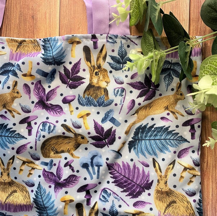 Our gorgeous hare-patterned reusable totes are a great addition to any shopping trip, with a cute print and functionality. The reusable shopping bags have a soft white lining, with the pretty nature design on the front, and a complimentary lilac backing that also matches the handles. Shop in style with our hare reusable tote, handmade here in Wales.