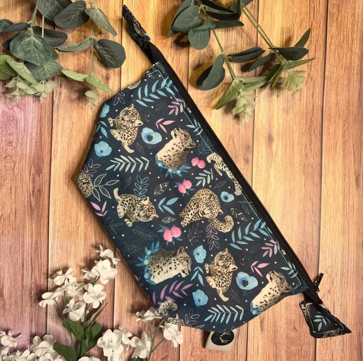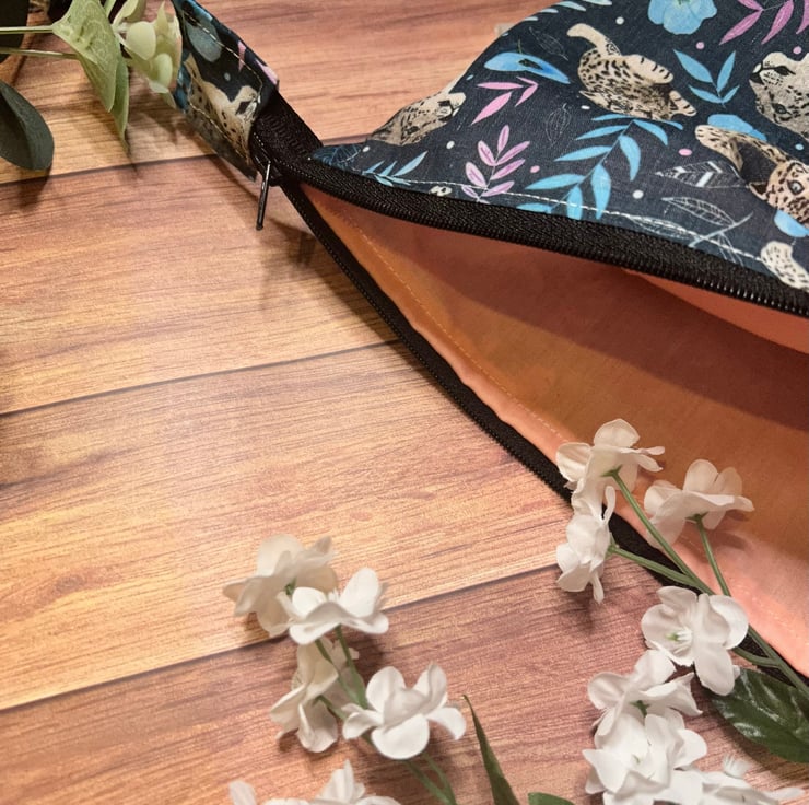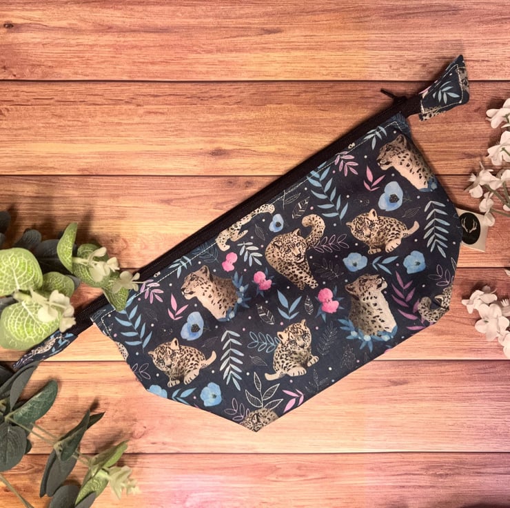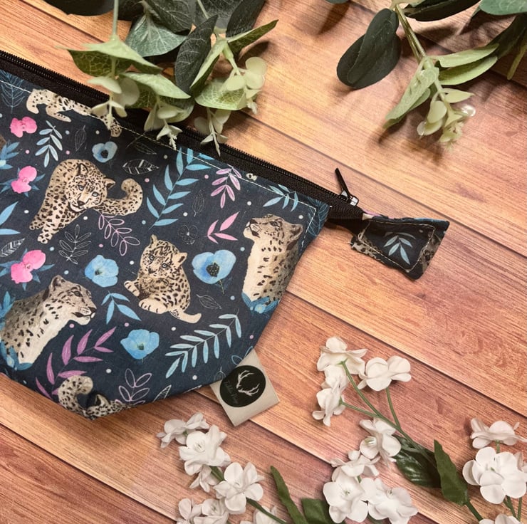 A new design to the store, the snow leopard makeup bag is a gorgeous example of an endangered creature and its surroundings. Showing two of their regions endangered flowers alongside it, the snow leopards pattern is a lovely example of a dark blue and pink colour scheme, shown here on this makeup bag. The makeup bag also has a soft pink lining, and opens wide for easy access to all those essentials.