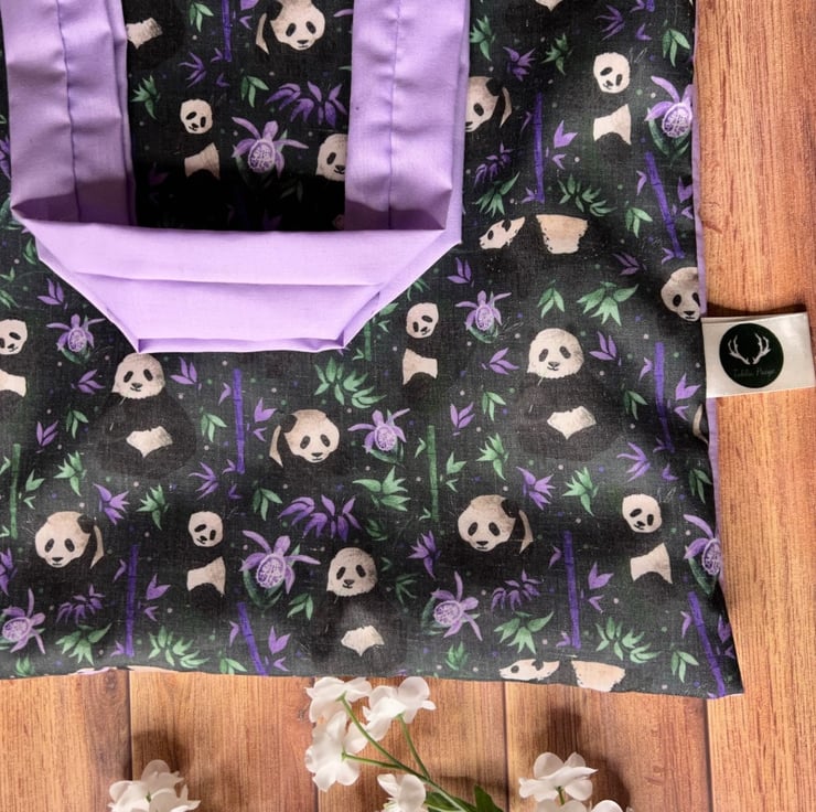 Our lovely new panda pattern is featured here on this tote bag, with a gorgeous lilac backing and white lining inside. Strong and secure, our panda tote will carry weight and also look good doing it with its dark, pretty pattern.