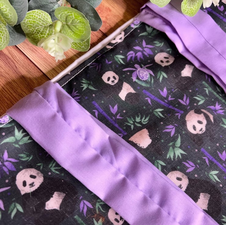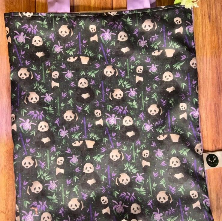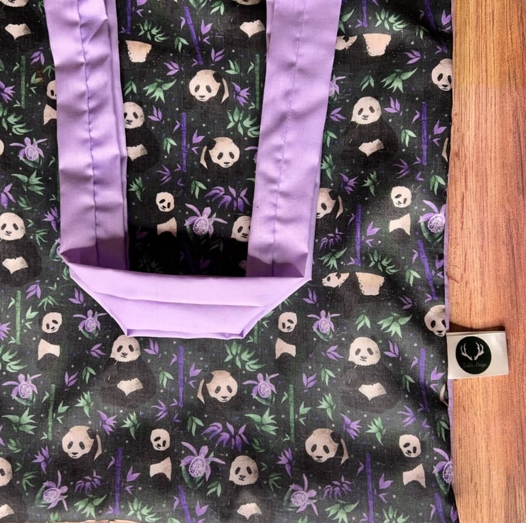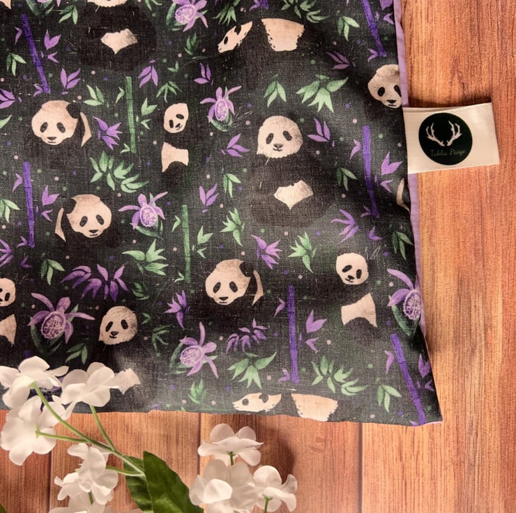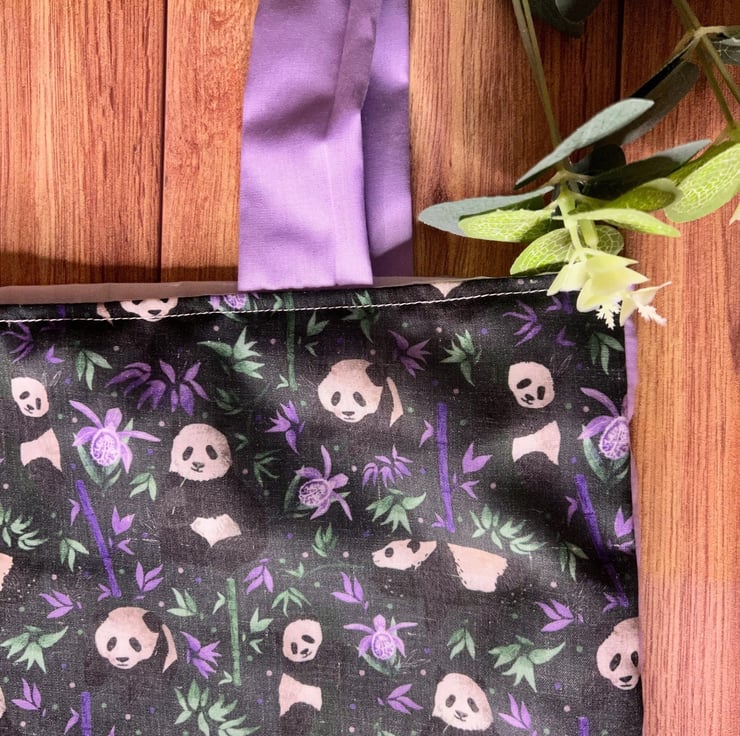 Our lovely new panda pattern is featured here on this tote bag, with a gorgeous lilac backing and white lining inside. Strong and secure, our panda tote will carry weight and also look good doing it with its dark, pretty pattern.