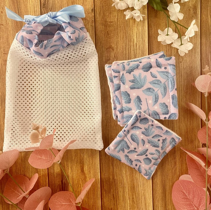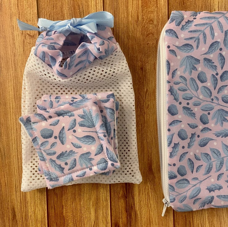 Our reusable pouch, makeup removal pads and washbag giftset is the perfect solution for the environmentally-conscious, simply use, wash and reuse with a convenient way to store and carry. The cute foliage pattern features across all three products, handmade right here in Wales.