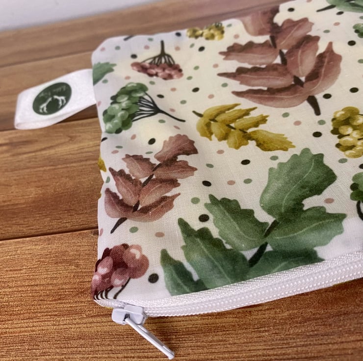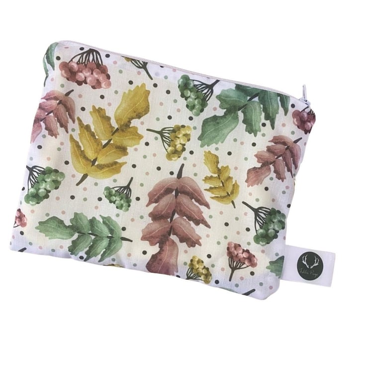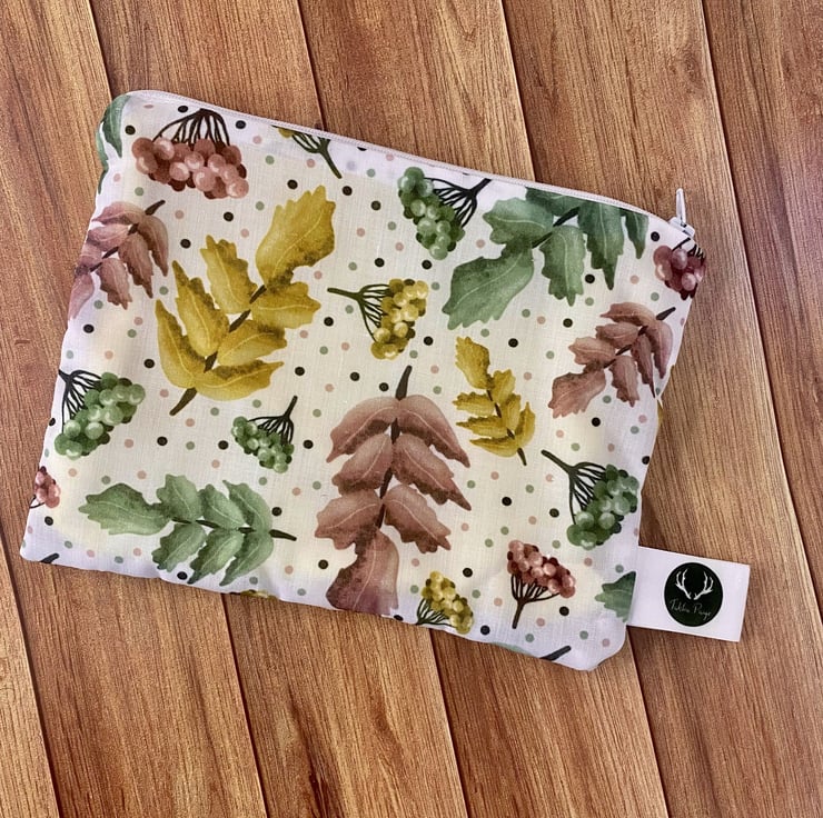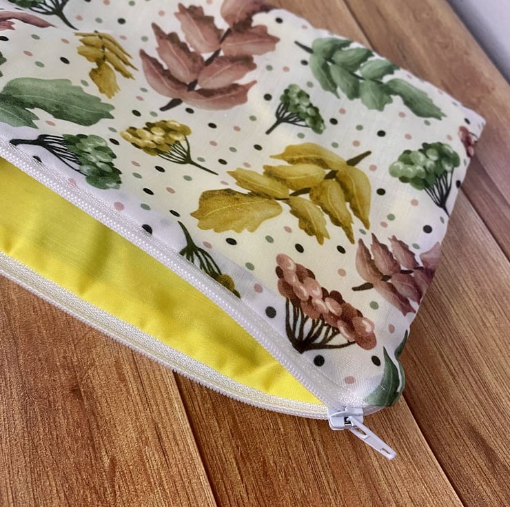 Our lovely pretty foliage and berries pattern is shown here on a simple zipper pouch, the ideal accessory for carrying makeup on the go, or even as a cute pencil case. The soft cotton exterior is decorated with the bold foliage print, with a complementary yellow lining.