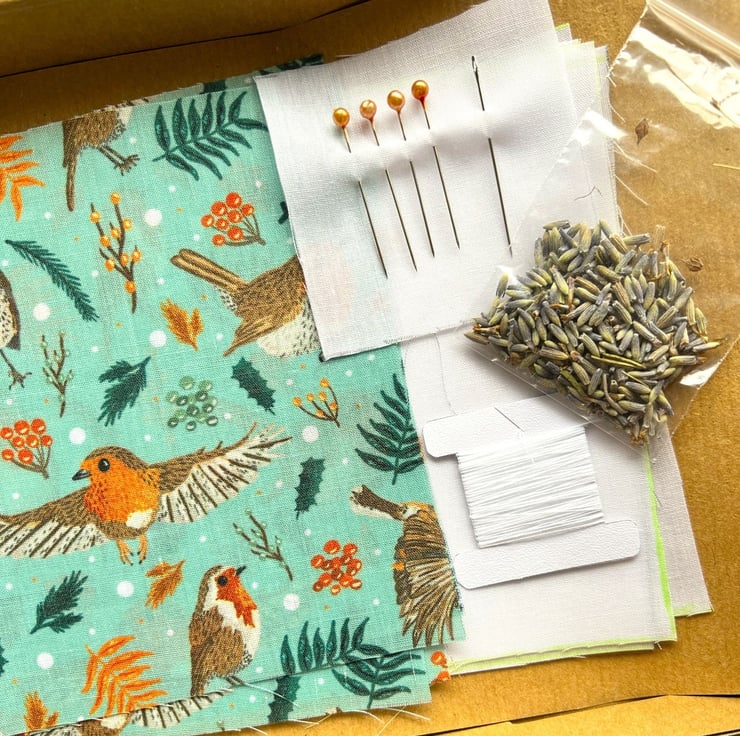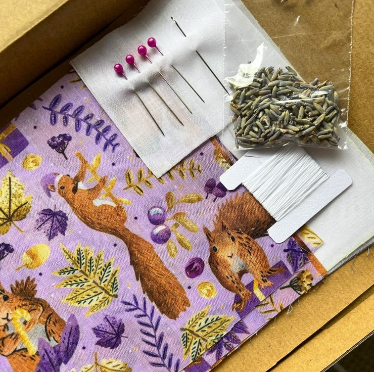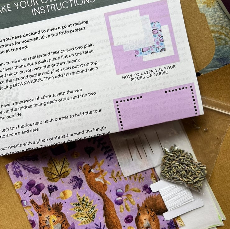 The kit includes instructions in written form, as well as a link to an instructional video on Youtube where you can follow along the process step by step. It includes the fabrics, needle, thread, pins, and the lavender to add the lovely scent, you'll just need plain dry rice, and a pair of scissors.