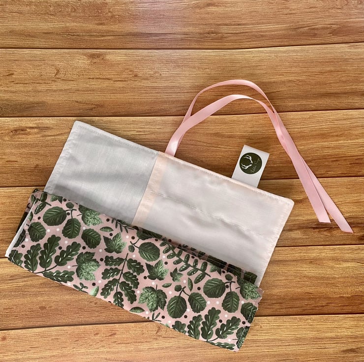 Our wraps are designed to hold a number of items and be neatly rolled and secured with a ribbon to keep your brushes contained. The brush roll is machine-washable, so don't be afraid of putting those bronzed brushes in there, to ensure the brushes keep their shape and do not pick up unnecessary bacteria rolling around in the bottom of a bag! The wraps have a cute patterned backing, with complimentary-coloured linings to form the pockets on the inside.