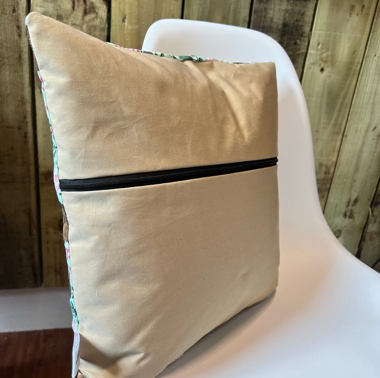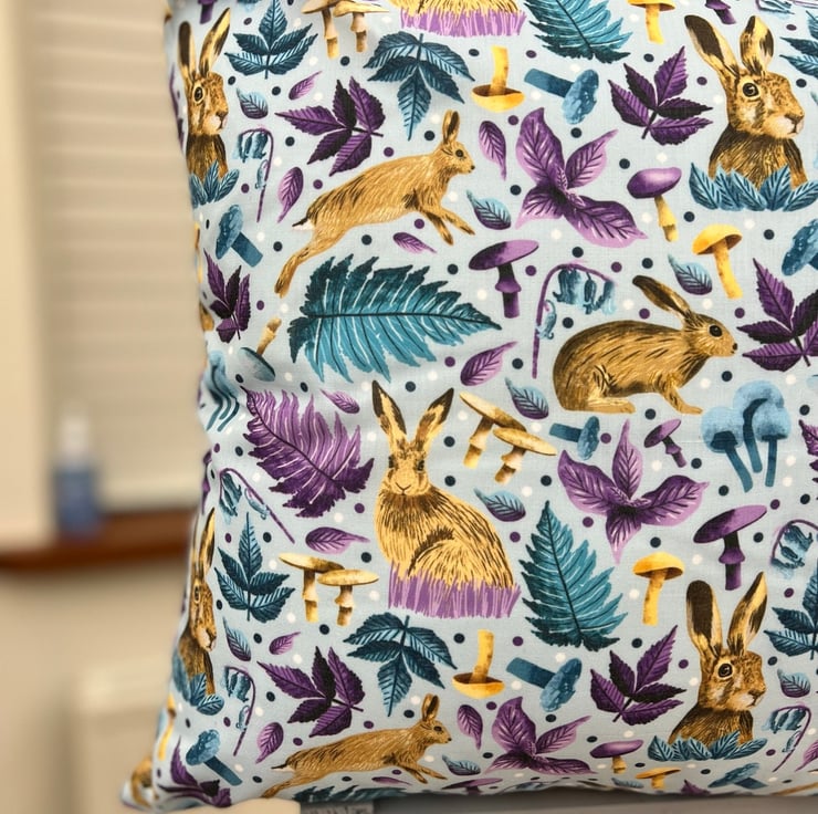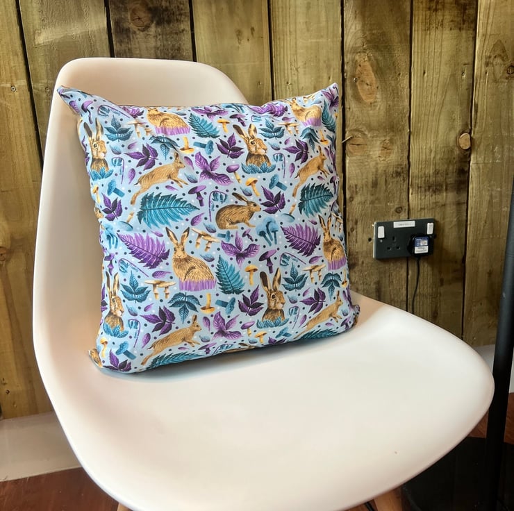 Our gorgeous hare cushion is a unique addition to any living space. With a bright hare pattern on the front, our cushions have a lovely beige backing that goes with any space, and a black statement zip for easy changing.