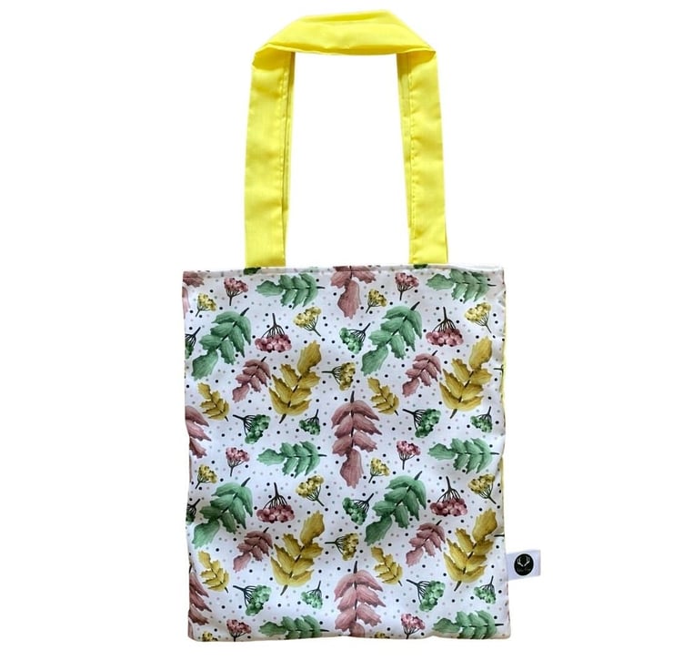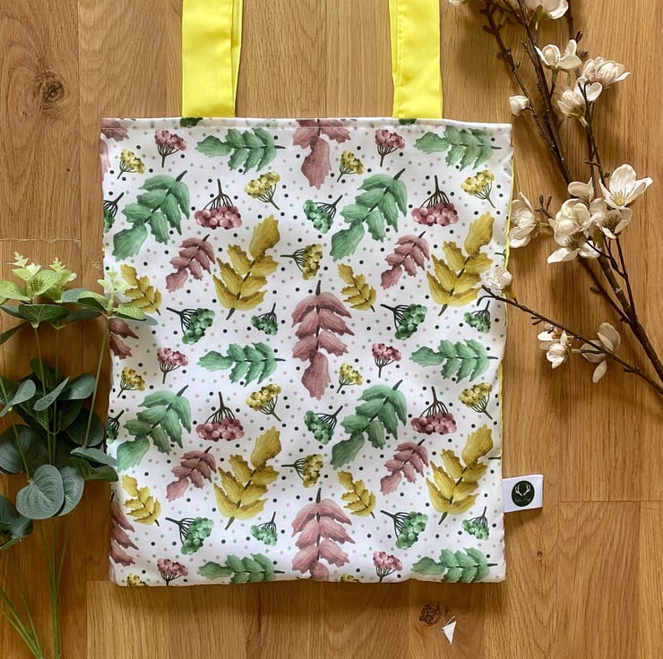 Our gorgeous foliage-patterned reusable totes are a great addition to any shopping trip, with a cute print and functionality. The reusable shopping bags have a soft white lining, with the pretty foliage and berries design on the front, and a complimentary yellow backing that also matches the handles. Shop in style with our hedgehog reusable tote, handmade here in Wales.