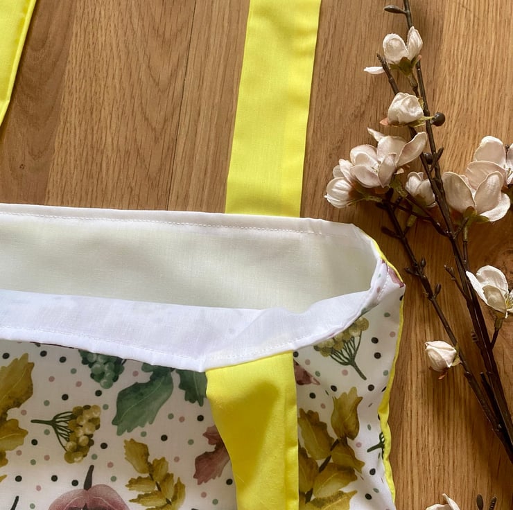 The reusable shopping bag is made from soft avio cotton printed with a cute design on the front, and a complimentary colour for the back and the straps with a soft white polycotton lining. The tote is the perfect size for popping to the shops, taking a stroll or taking a towel to the beach.