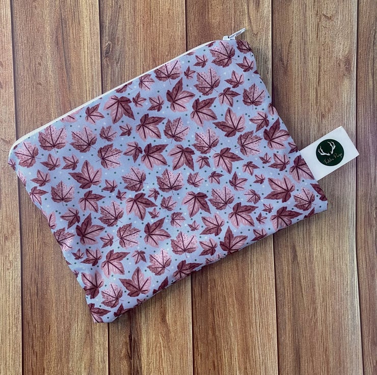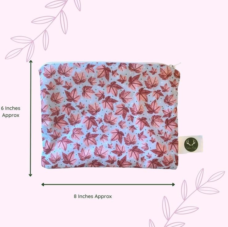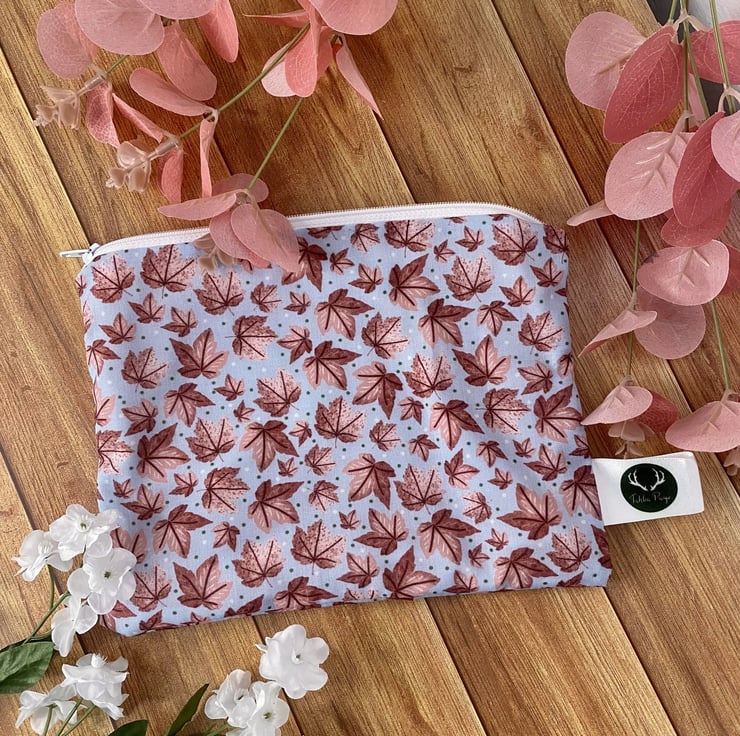 Our lovely pink leafy pattern is shown here on a simple zipper pouch, the ideal accessory for carrying makeup on the go, or even as a cute pencil case. The soft cotton exterior is decorated with the bold foliage print, with a complementary pink lining.