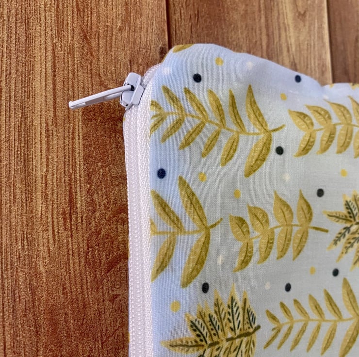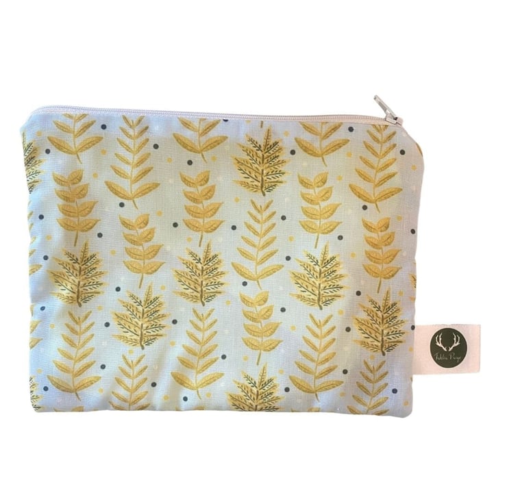 Our lovely yellow foliage pattern is shown here on a simple zipper pouch, the ideal accessory for carrying makeup on the go, or even as a cute pencil case. The soft cotton exterior is decorated with the bold leafy print, with a complementary yellow lining inside.
