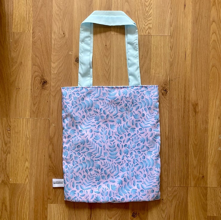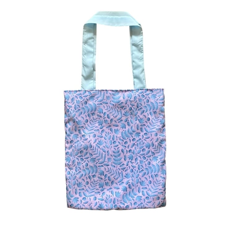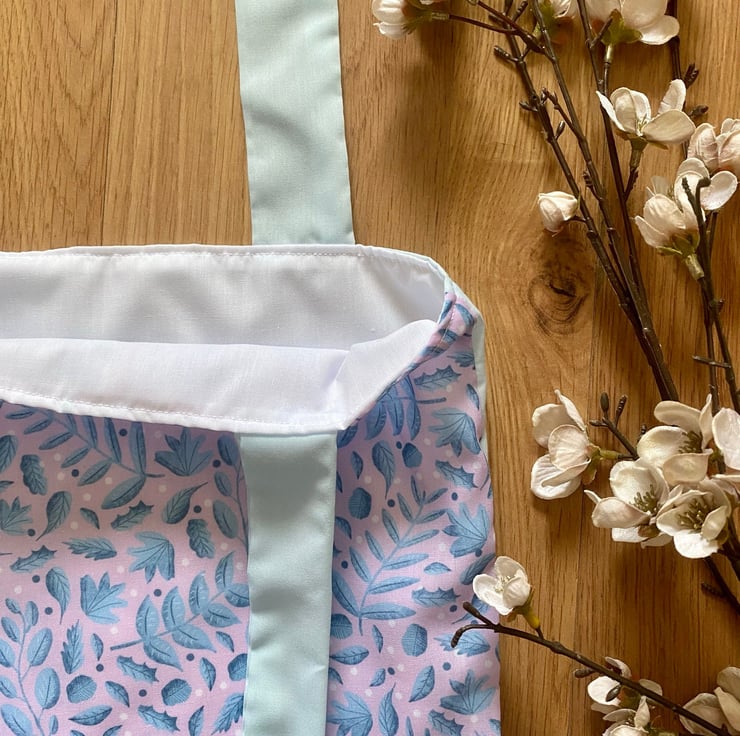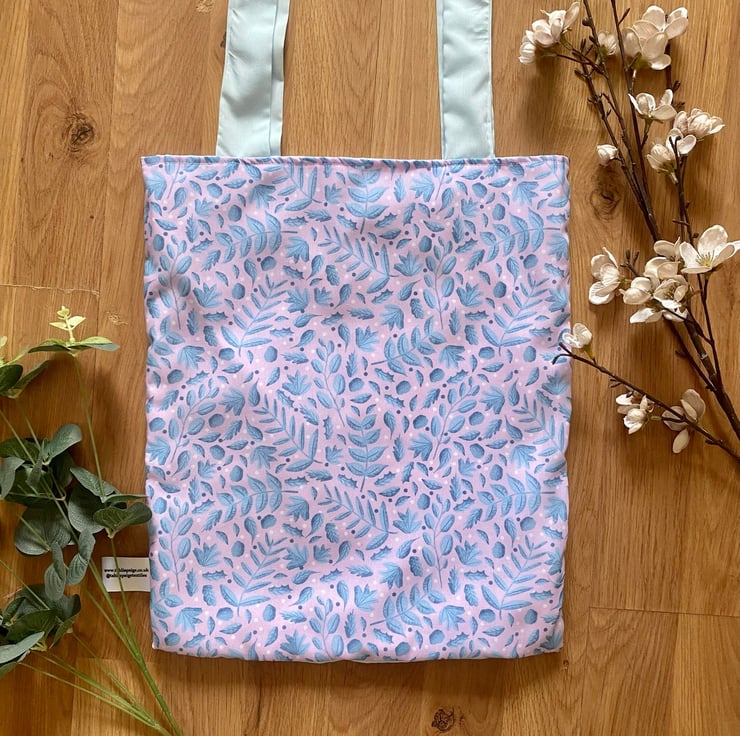 Our tote bag in the blue foliage pattern is ideal for someone who enjoys a good shop! Easy to fold up and keep safe in a handbag, our totes are useful and spacious to carry all those essentials, no matter where you are going. Check below for exact sizing. The bag features a lovely foliage pattern n the front, and a blue backing, with a soft white lining for added strength too.
