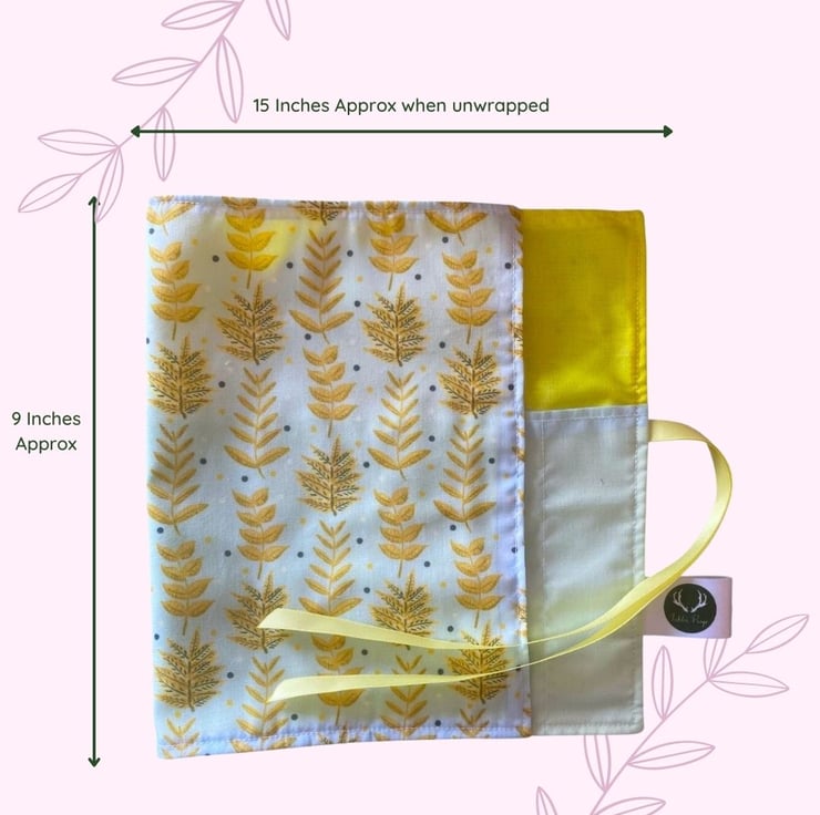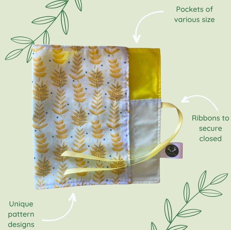 Our Yellow Foliage brushwrap is an ideal gift for an artist, or makeup artist, anyone who needs to carry or transport brushes or other equipment. These wraps are fab because you can slip all your things into the little pockets inside, and wrap it up and secure with the matching yellow ribbons. Made from soft cotton, the brushwrap can be washed, I recommend gently to avoid losing any colour in the fabric, and used time and time again.