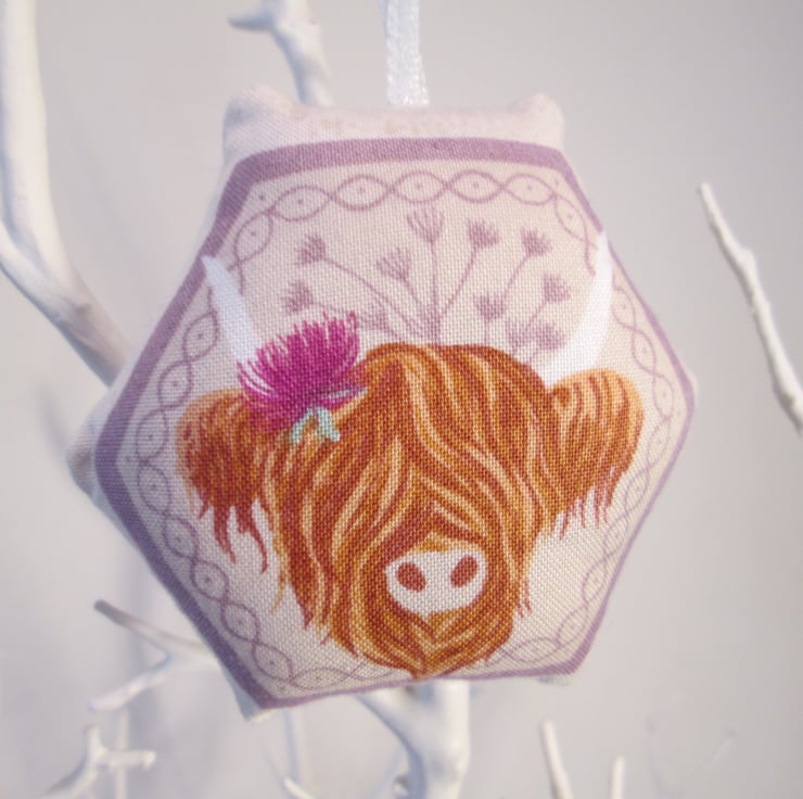 An adorable pillow filled with English lavender and hollow-fibre stuffing just ideal for hanging anywhere as a decorative item or in a wardrobe or drawer as lavender is a renowned natural moth repellent. This lavender bag measures approximately three and a quarter inches (8.5 cm) at its widest point and is pleasingly filled to give a plump look. The front shows a lovely highland cow and is patterned on the back, with a hanging loop of cream satin ribbon (3.5 in / 9 cm). This quaint item has a lovely traditional scent and makes a lovely gift as well as something for yourself.
