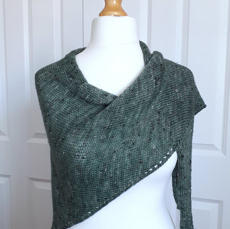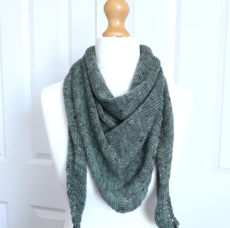 Made from hand dyed merino wool, this triangular shawl is beautifully soft and light, but also very warm and cosy. It has been lovingly knitted on a hand operated knitting machine using beautifully soft Merino wool with Donegal Nep, and features eyelets along two sides for a decorative finish.