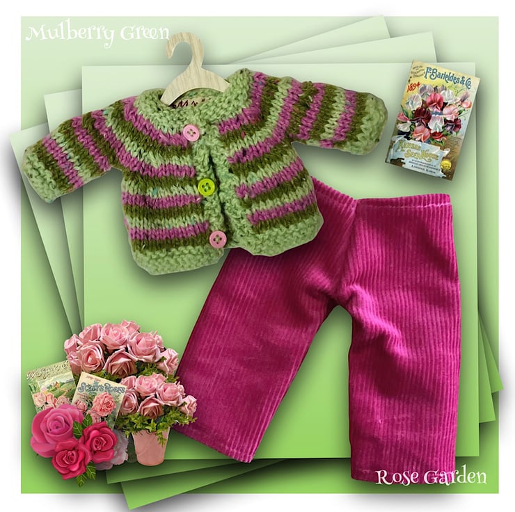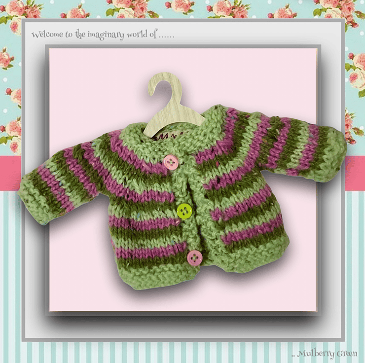 A sweet little striped terrazzo wool cardigan in shades of pink and green, to fit the Mulberry Green characters. The cardigan is hand knitted and matches The other ‘Rose Garden’ items in my shop.