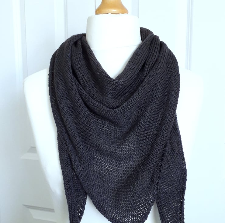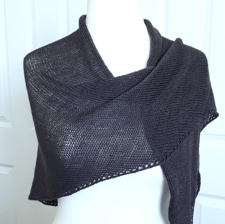 Made from a laceweight wool/silk blend yarn in a charcoal colourway, this luxurious triangular shawl is beautifully soft and light. It has been lovingly knitted on a hand operated knitting machine and features eyelets along two sides for a decorative finish.