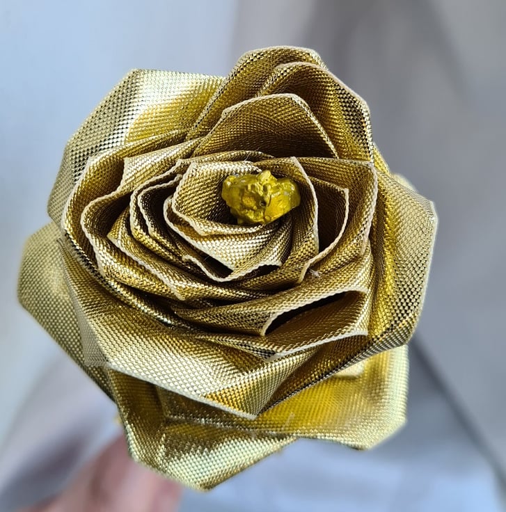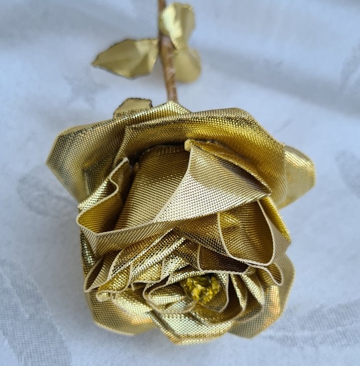 Gorgeous Handmade Gold Lame Ribbon Rose - Long Stem Artificial Forever Flower Gift.