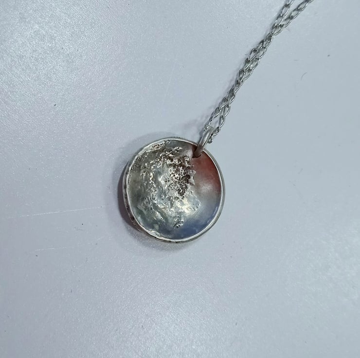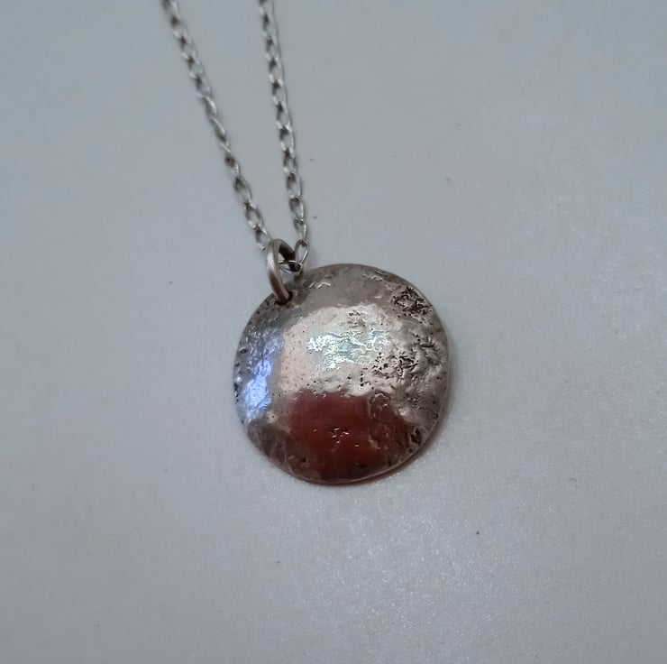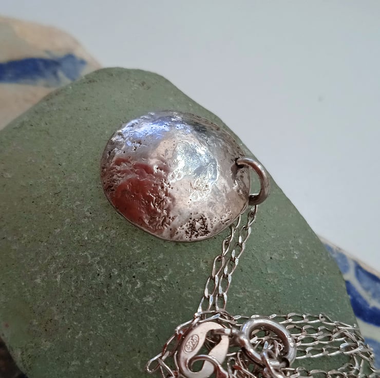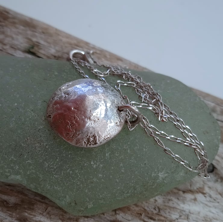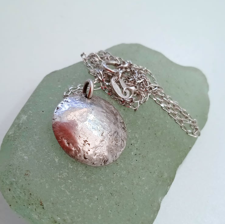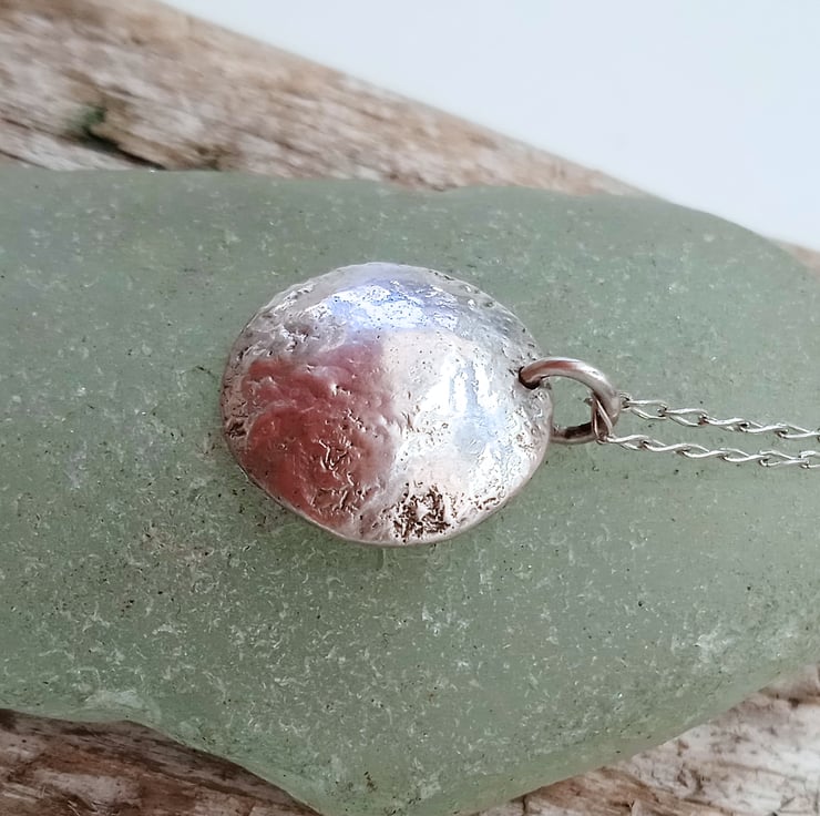 This beautiful hand crafted sterling silver pendant has an attractive unique irregular 'reticulated' finish to create an attractive organic, abstract style surface design. This has been achieved by repeatedly heating and cooling the silver multiple times. The pendant has been domed to create shape, polished and can be worn either way round.