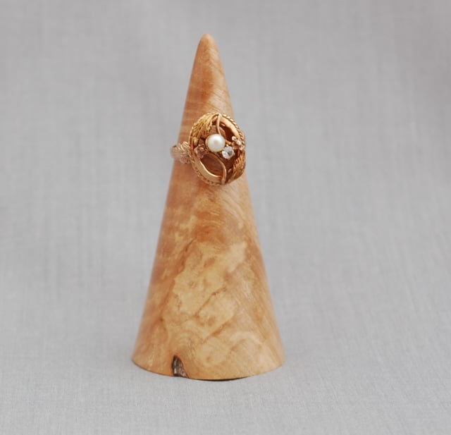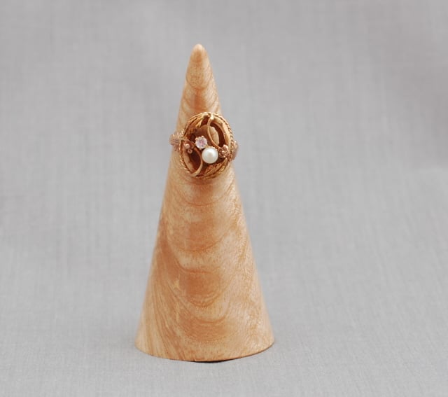 The light seems to shimmer and move in places on this ring cone turned by Randal. Made in Yorkshire grown ash, is measures approximately 7.5 cm high and 3.5 cm wide at the base. When “naked” it is a visual delight, and when in use it highlights the beauty of the rings.