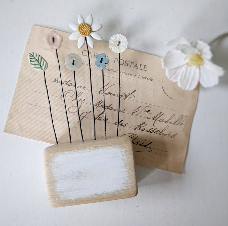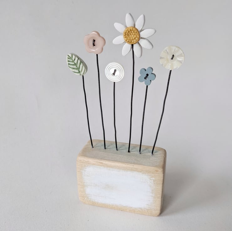 A pretty clay daisy flower and leaf stand on wire stalks in a sanded and painted wooden block.