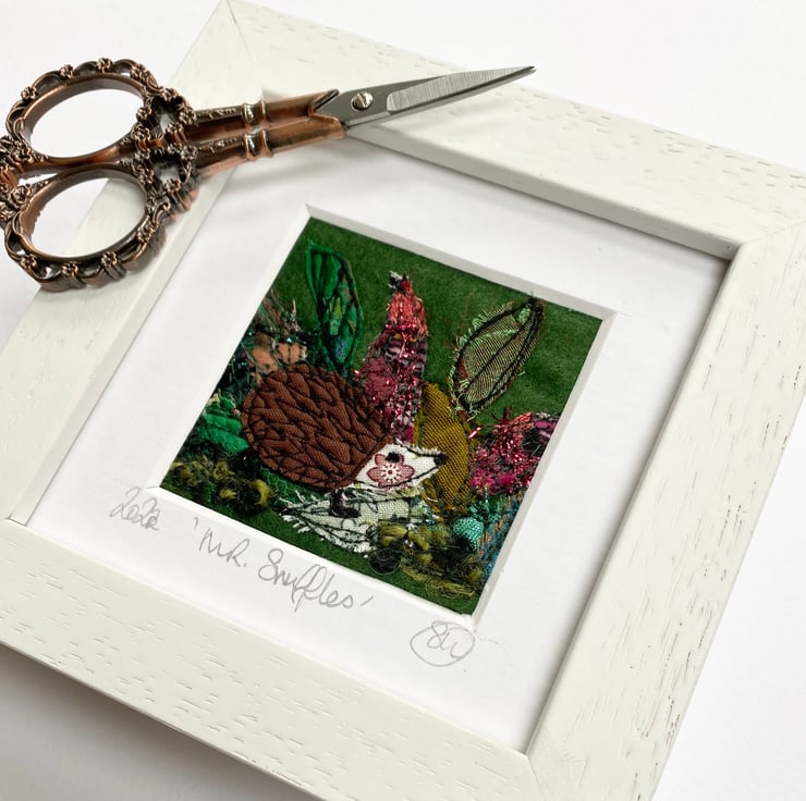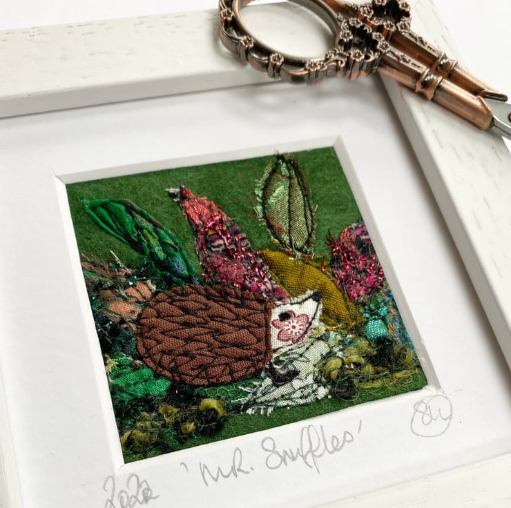 This sweet little piece is of Mr. Snuffles. He's rooting around leaves looking for his breakfast. He’s made with up-cycled fabrics and embellished with free motion embroidery.