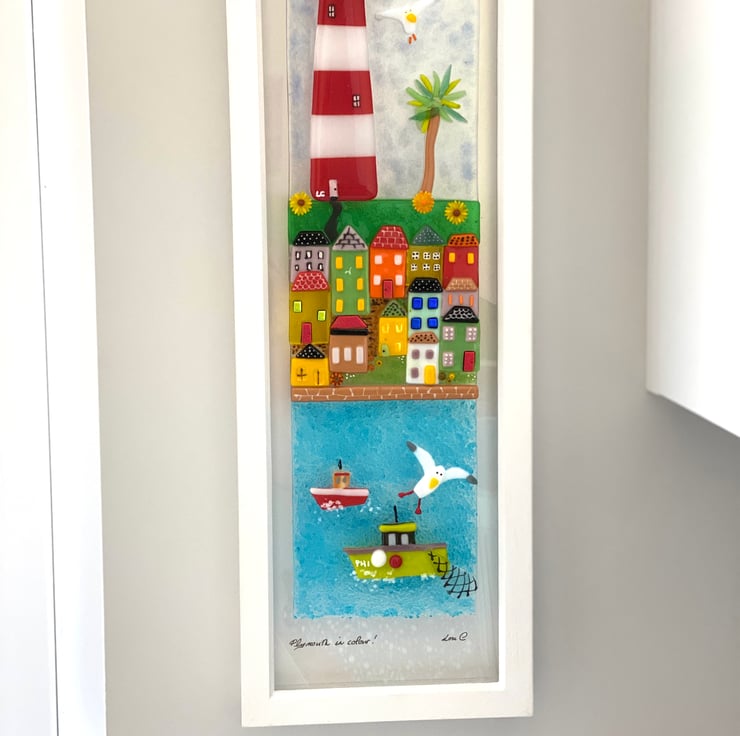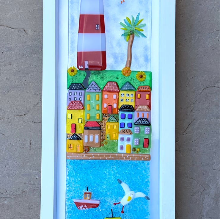 Gorgeous contoured and vibrant glass makes this picture really pop ! . Overall dimensions approximately 18 x 8 inch . All of the art is beautifully smooth and shiney whilst still being contoured . Created over two separate firings and including lots of dichroic glass detailing . This picture would make a stunning addition to any home . Posted by next day tracked parcel force . Please feel free to contact me if you have any questions .