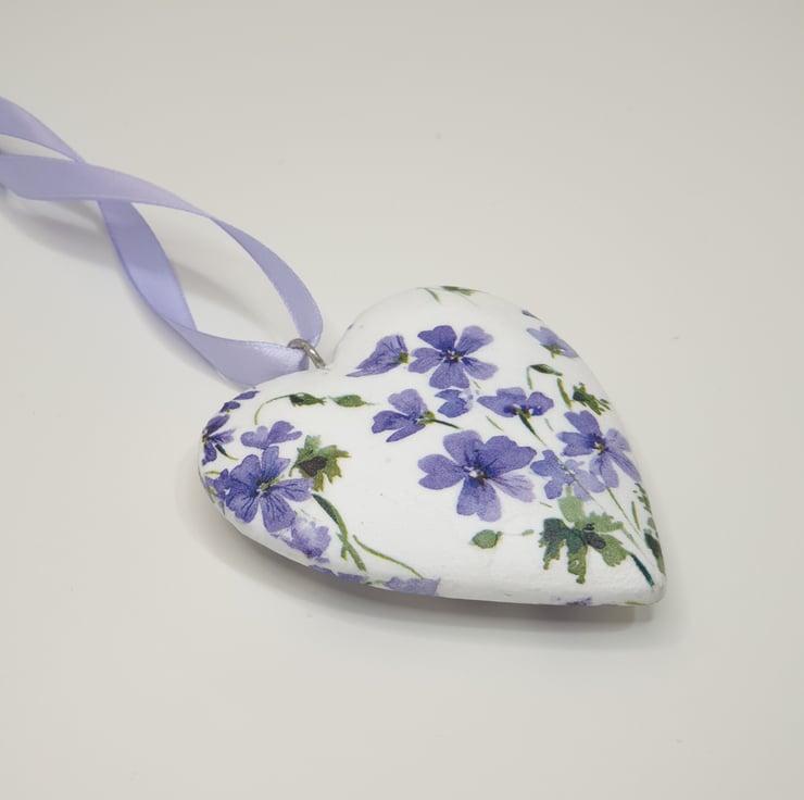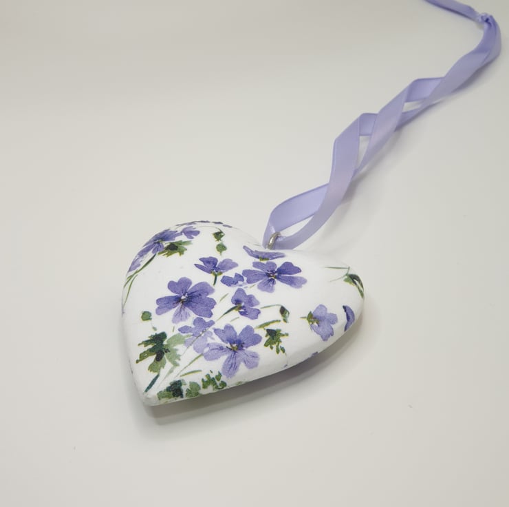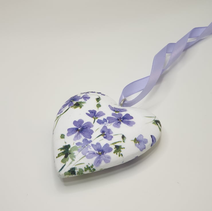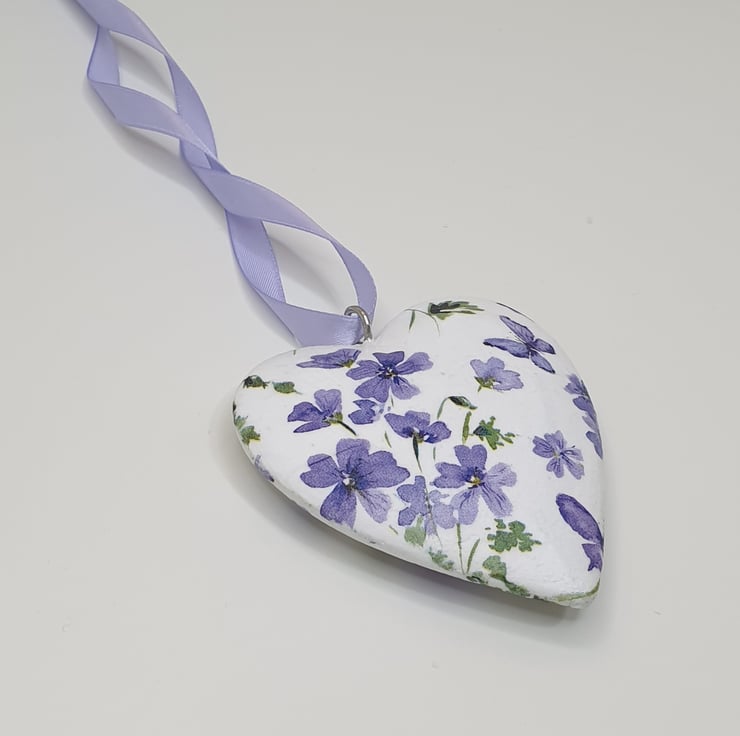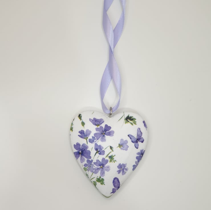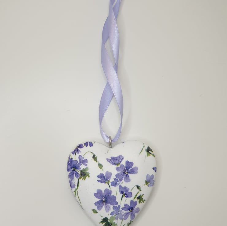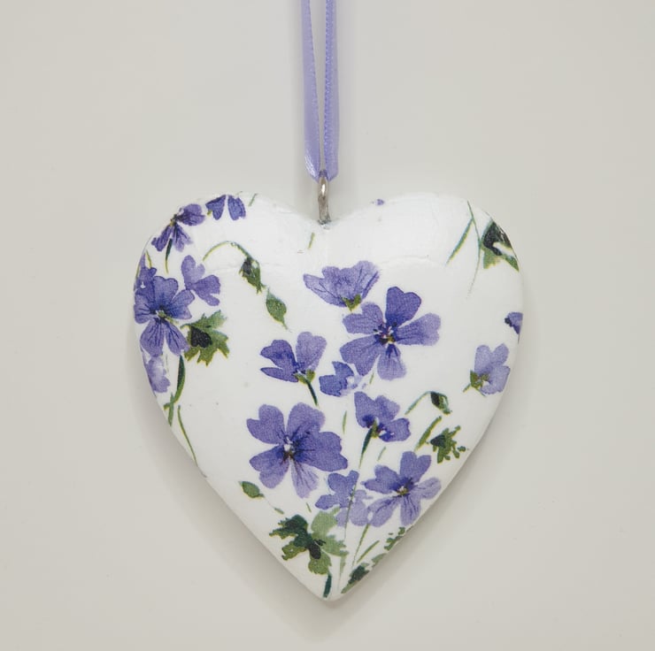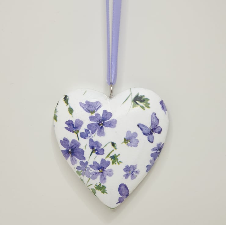 Floral hanging heart decoration made of wood which has been painted white and then decoupaged with pretty purple flowers. The heart has been sealed and finished with matching satin ribbon ready to hang. This solid heart has been decoupaged on both sides so would lovely hung in a window or from a mantlepiece, handle or piece of furniture.