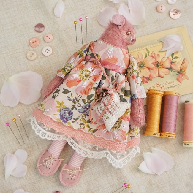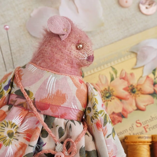 This is a little pink mohair mouse made from Steif German Sparse Pink Mohair. Her face is hand embroidered with copper beads for her eyes. She is dressed in a pretty vintage Liberty print fabric with matching underskirts in cotton and lace. She has little pink leather ears and a tiny pink leather tail peeping our from her cotton broderie anglais drawers. She is firmly stuffed with rose petals to her stuffing for a gentle scent and with a rose quartz crystal to her heart.
