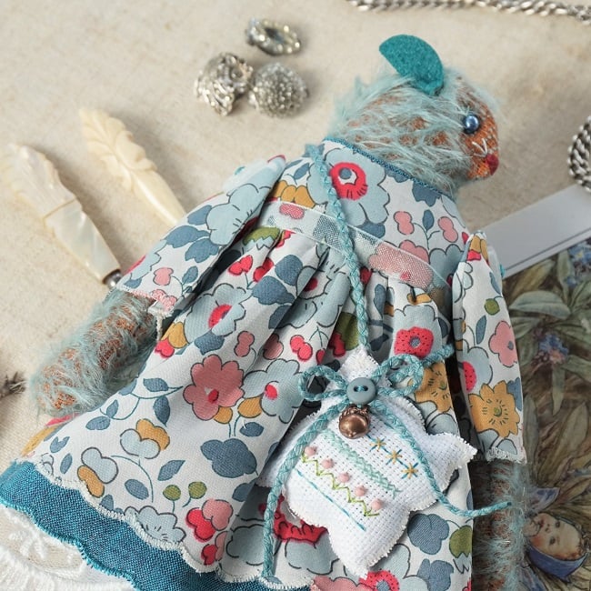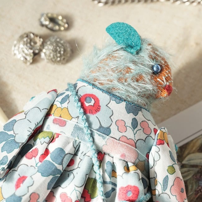 I am loving the little mohair mice, it is so great to work with this little mouse is dressed in a classic Liberty Print. I do love the sienna undertones to the aqua blue fur, a little sweetheart xx
