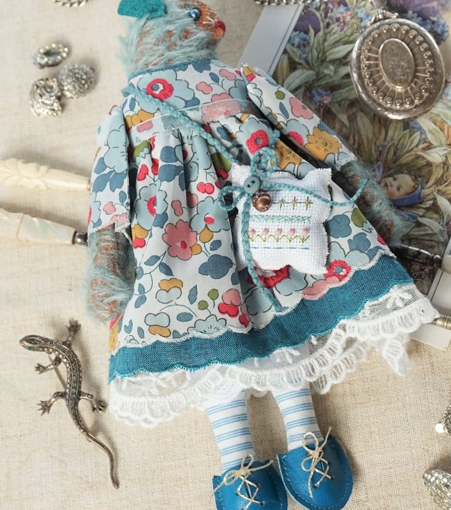 This is a little blue mohair mouse made from a German sparse mohair. Her face is hand embroidered with turquoise beads for her eyes. She is dressed in a pretty Liberty print fabric called Betsy Grey with matching underskirts in cotton and lace. She has little aqua leather ears and a tiny blue leather tail peeping our from her cotton broderie anglais drawers. She is firmly stuffed with lavender to her stuffing for a gentle scent and with a turquoise crystal to her heart.