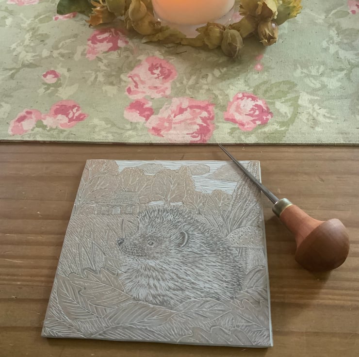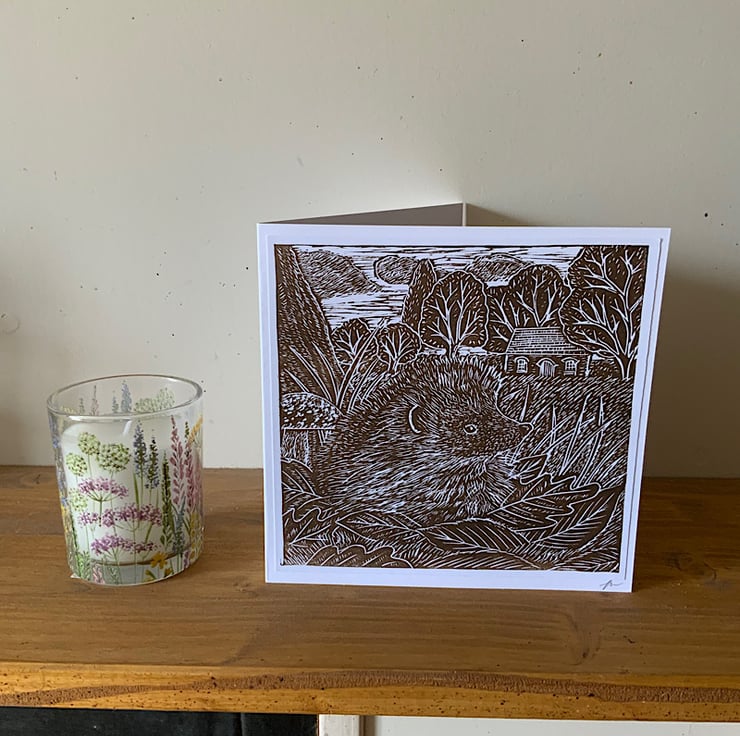 An original lino print card of a Hedgehog in Autumn. Hand printed in my home studio in the Yorkshire wolds, using eco friendly inks and my little relief printing press.